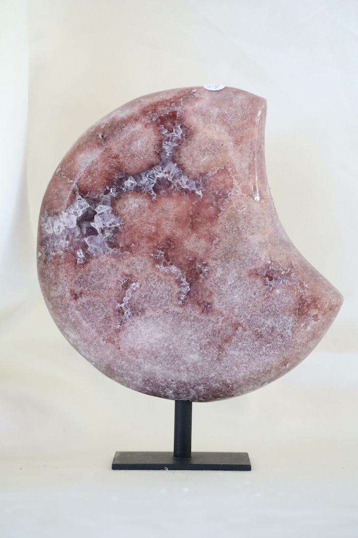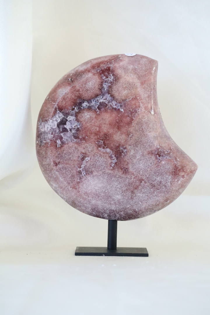 Een A-kwaliteit Roze Amethist maan op standaard (Roze Chalcedoon met Amethist) met zachte roze tinten en verfijnde kristalstructuren. Een rustgevend en stijlvol object voor een bewust interieur.