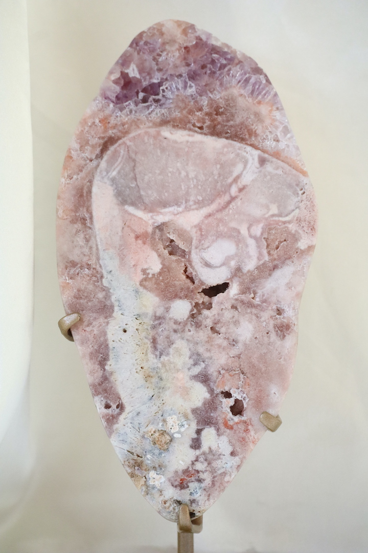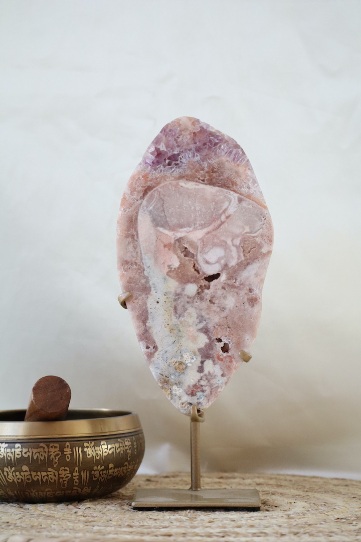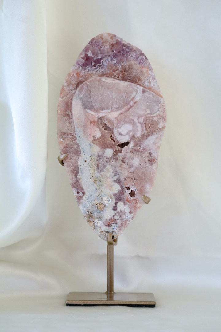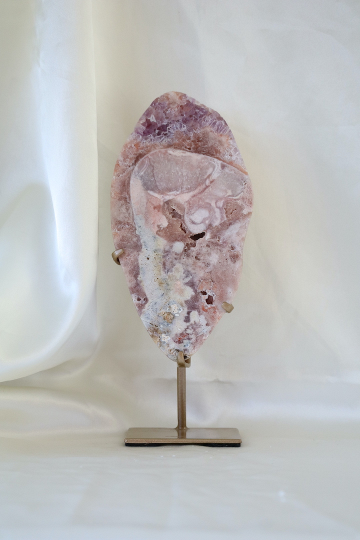 Een A-kwaliteit Roze Amethist op standaard (Roze Chalcedoon met Amethist) met zachte roze tinten en natuurlijke kristalvorming. Een krachtig en verfijnd object voor een rustig en bewust interieur.