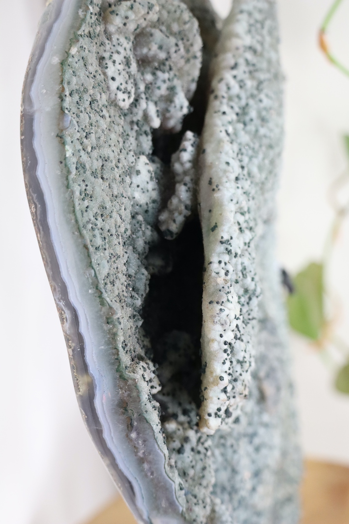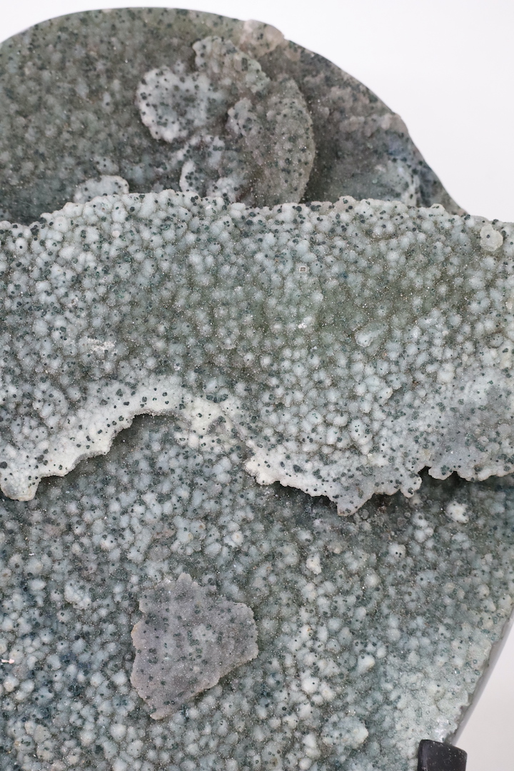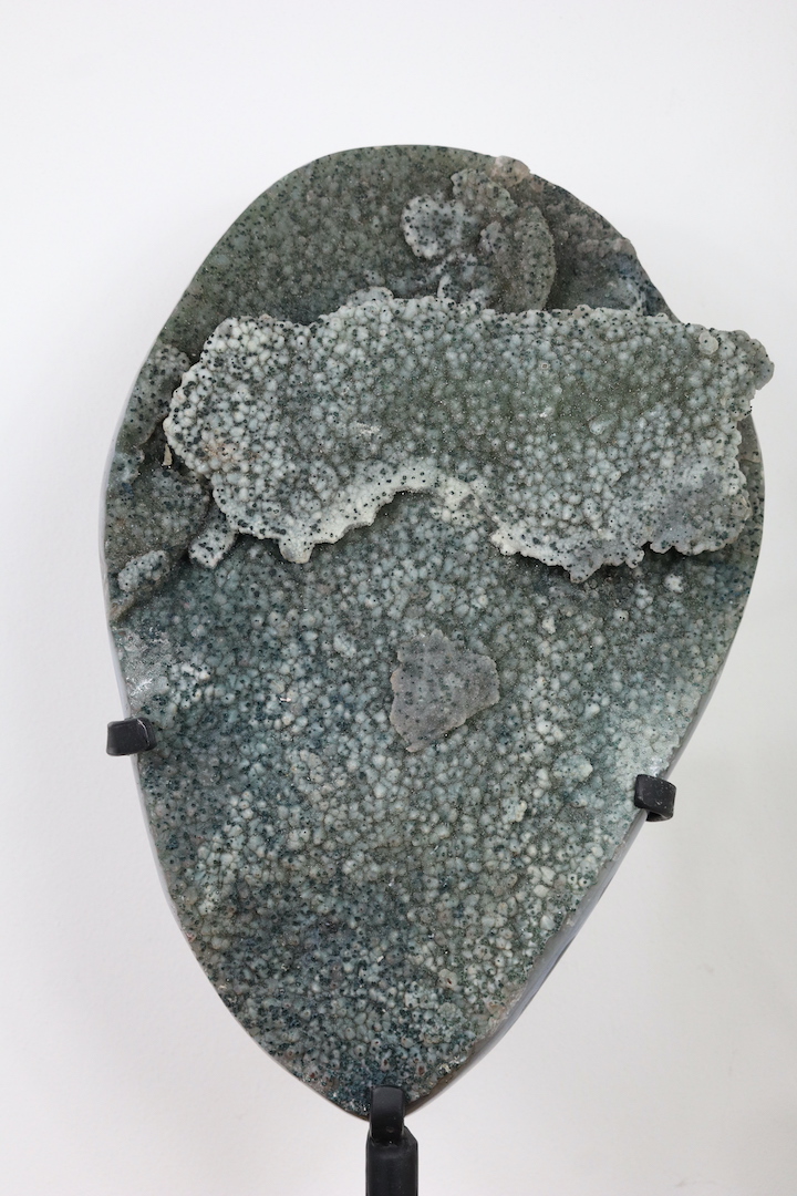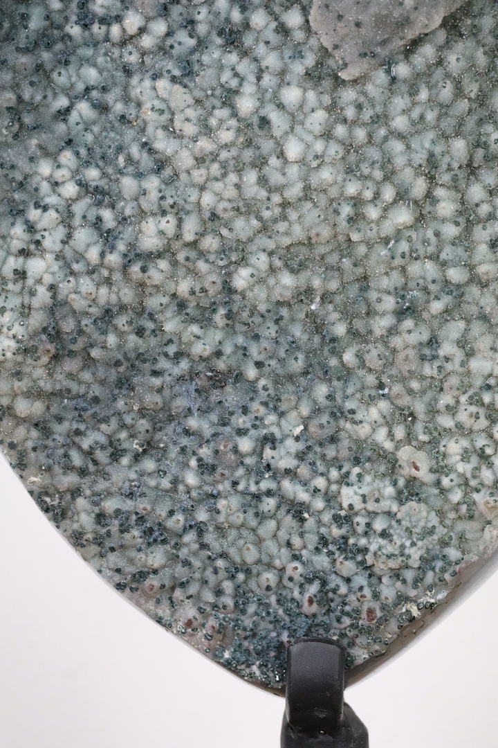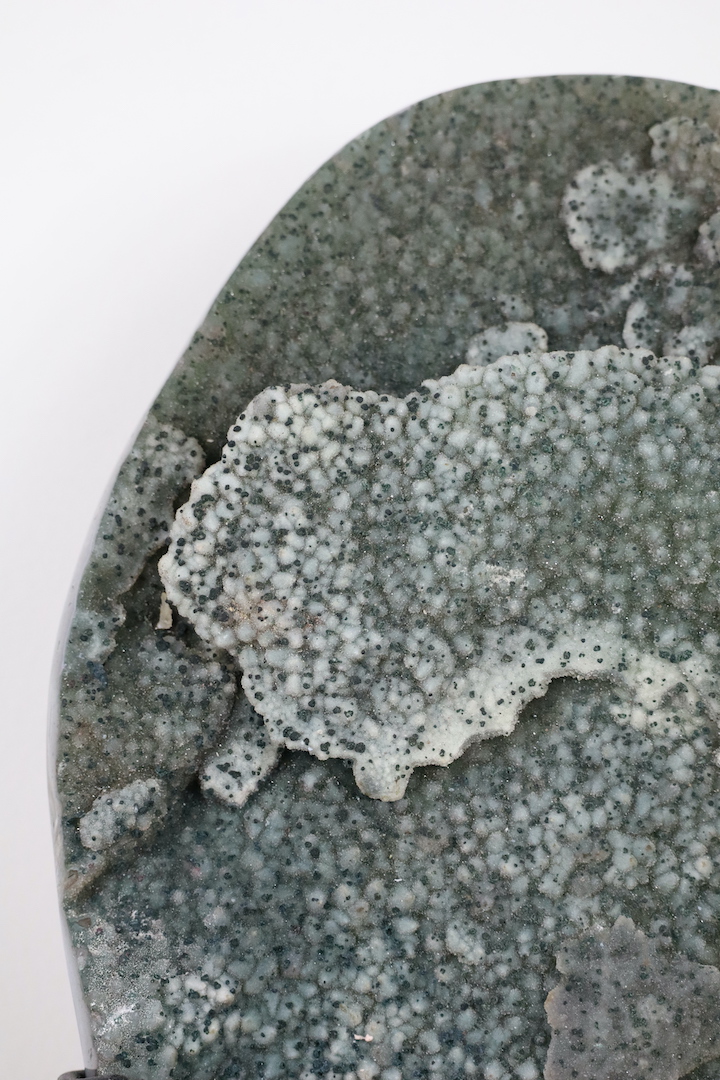 Chalcedoon is een microkristallijne vorm van kwarts die zich vormt door langzame silicificatie in holtes en aders; in dit exemplaar manifesteert dat zich als botryodale (druiventrosachtige) structuren in zachte wit-groene schakeringen. De aanwezige chloriet voegt een tweede dimensie toe: fijne groene insluitsels en vlekken die de textuur en visuele diepte versterken, waardoor het oppervlak een “galaxy-achtig” spel van licht en schaduw krijgt. De gepolijste agaatzijde laat de interne lagen en de overgang naar een geordende rand zien, en benadrukt de natuurlijke gelaagdheid van het stuk—een harmonie tussen organische groei en menselijke presentatie.