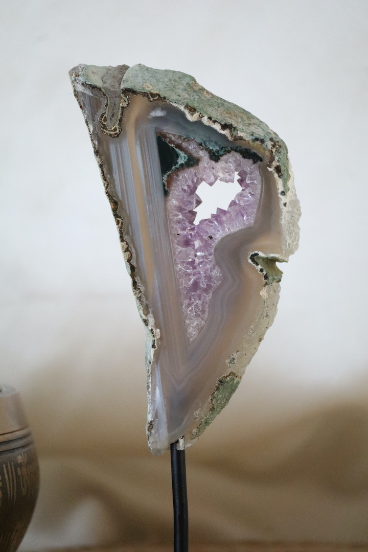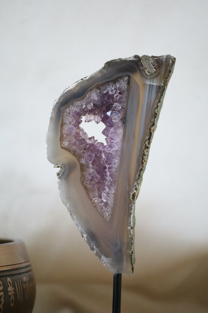 De A-kwaliteit van dit portaal is duidelijk zichtbaar in zowel de Amethistkristallen als de omliggende agaat. De kristallen hebben een heldere, zachte paarse kleur en een mooie glans. Ze zijn gelijkmatig gevormd en liggen diep in het portaal, wat zorgt voor diepte en rust. De omlijstende agaatlagen tonen een verfijnd lijnenspel in zachte grijs-, beige- en lila-tinten, kenmerkend voor hoogwaardige agaatformaties.