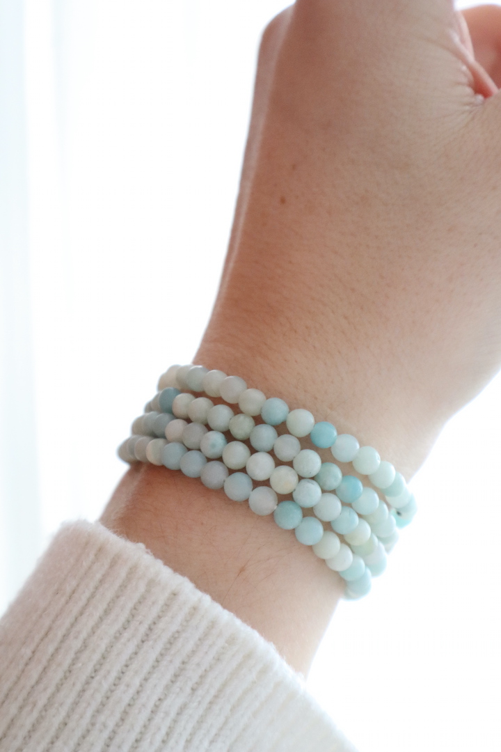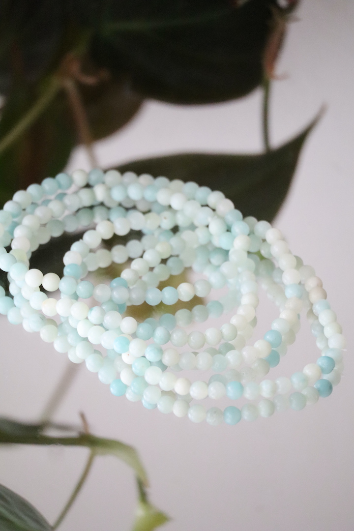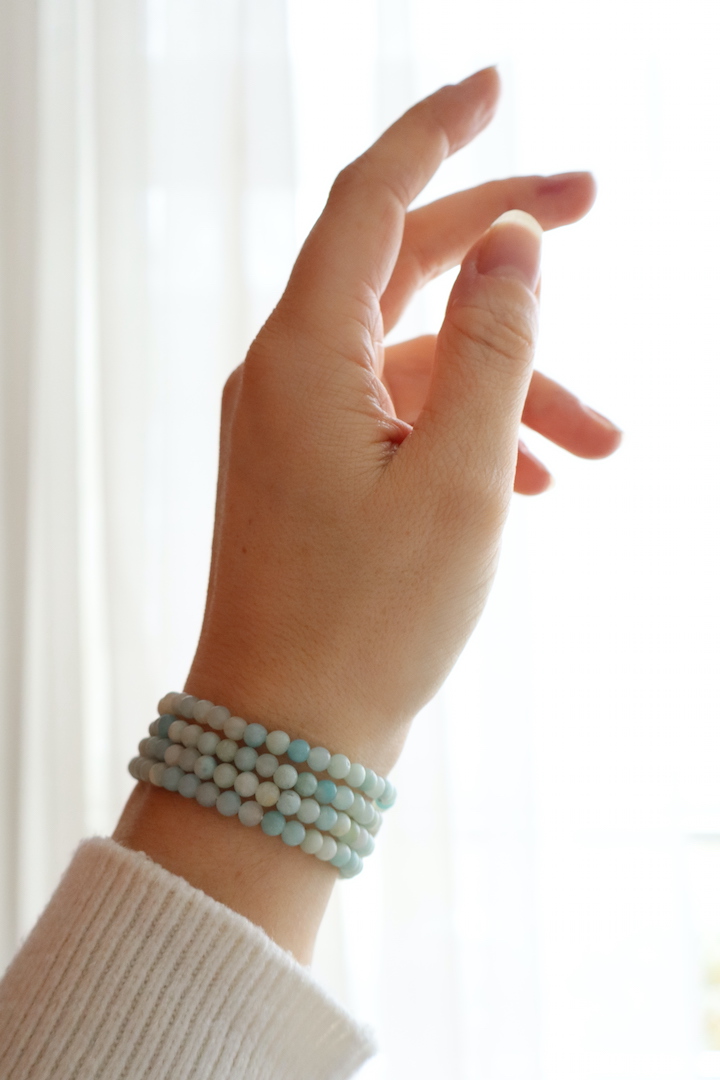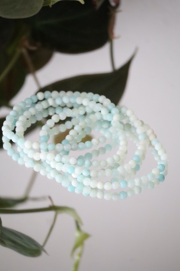 De Amazoniet armband van 4mm kralen is verfijnd, subtiel en zacht van uitstraling. De matte kralen tonen een harmonie van poederachtig mintgroen, zacht aqua en roomwit. Een kleurenpalet dat direct rust brengt — alsof je kijkt naar een kalme zee onder een lichte ochtendlucht.