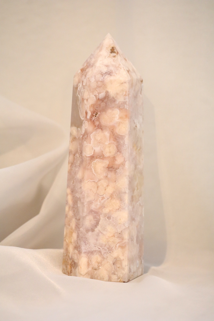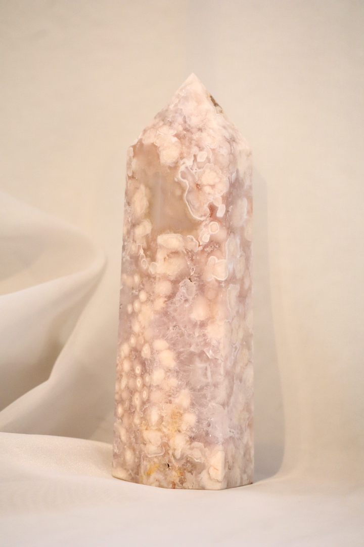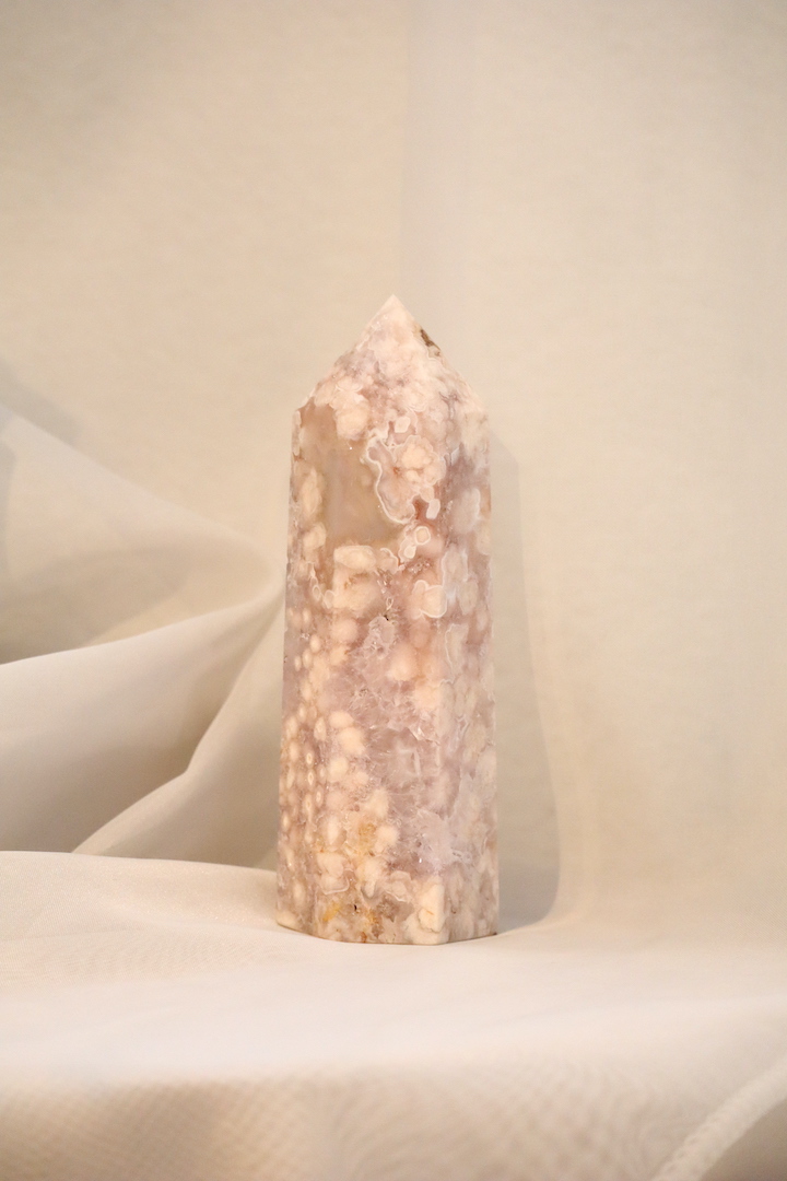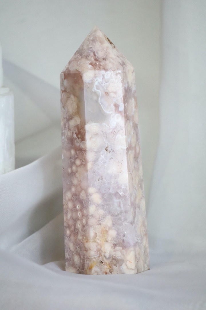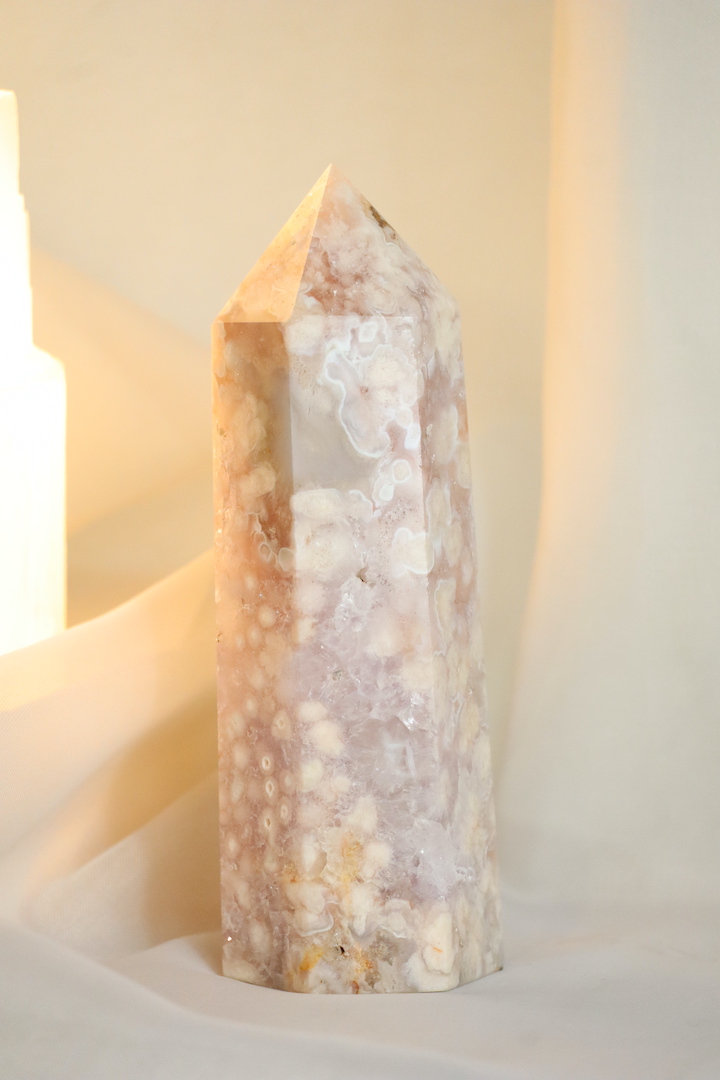 Deze Amethist Bloemagaat toren uit Madagascar is een waar kunstwerk uit de natuur: zeldzaam, sierlijk en met een zachte, vrouwelijke energie die direct voelbaar is zodra je haar in handen houdt. Met haar prachtige bloesem-achtige patronen, doorschijnende lilaparels en melkachtige agaatstructuren vormt ze een uitnodiging om te vertragen, te ademen en thuis te komen bij jezelf.