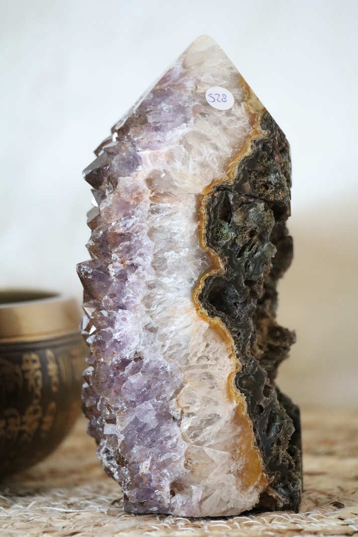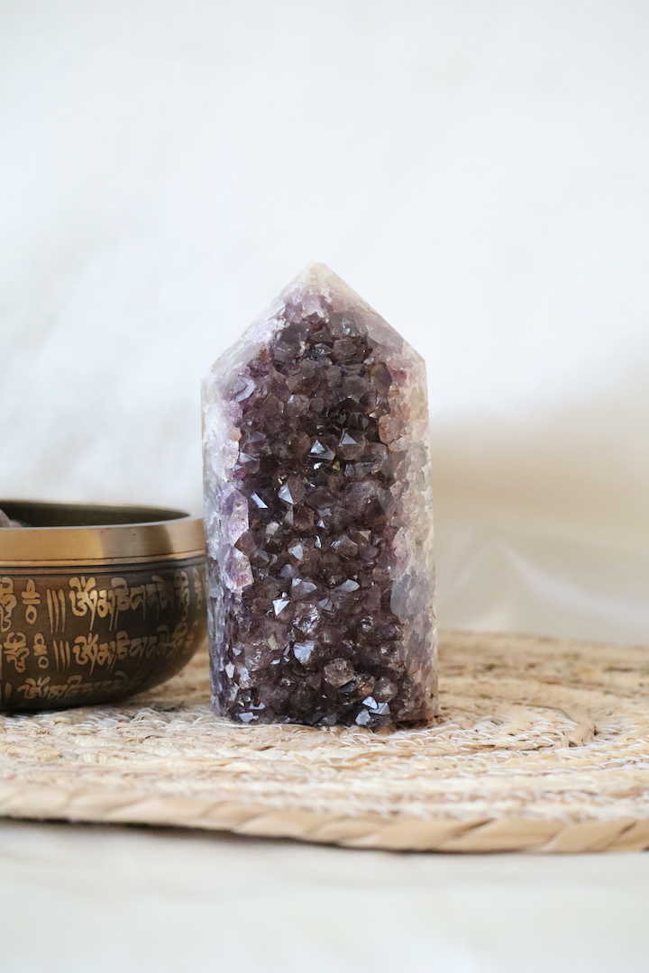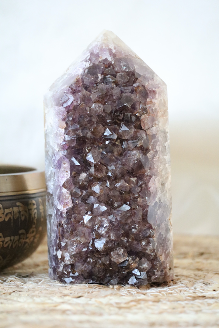 Amethist wordt vaak gekozen om een rustige en heldere sfeer te ondersteunen. In combinatie met goethiet ontstaat een steen met een meer aardende, beschermende uitstraling. Deze toren is daardoor bijzonder geschikt voor een werkruimte, praktijk, meditatiehoek of plek waar focus en stabiliteit gewenst zijn. Het is een stuk dat aanwezig mag zijn, zonder schreeuwerig te worden.
