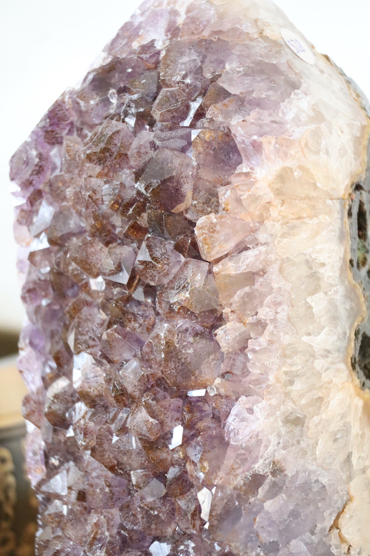 Wat deze toren bijzonder maakt, is de rijke aanwezigheid van goethiet. Door deze natuurlijke insluitsels kleurt de Amethist aan de bovenkant roodachtig tot warm paars, wat zorgt voor een diepte en gelaagdheid die je niet vaak ziet. De goethiet zelf heeft een goudkleurige tot bronsachtige glans, die subtiel zichtbaar is tussen de kristalpunten en het stuk een bijna aardse warmte geeft.