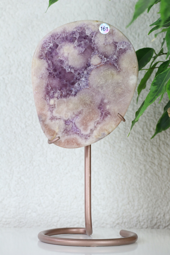 Deze betoverende Amethist met Chalcedoon Slab op Standaard combineert de krachtige eigenschappen van Amethist en Chalcedoon, twee kristallen die bekend staan om hun vermogen om de geest te kalmeren, emotionele balans te bevorderen en spirituele zuivering te ondersteunen. De Amethist staat bekend om zijn diepe spirituele bescherming en innerlijke rust, terwijl Chalcedoon, ook wel Roze Chalcedoon genoemd, een steen is die het hartchakra opent en zelfliefde bevordert. Samen zorgen deze kristallen voor een harmonieus samenspel van positieve energie, kalmerende vibraties en emotionele heling.