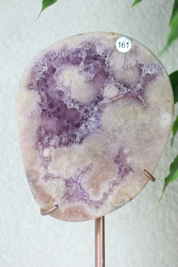 Deze slab is zorgvuldig gevormd en gepositioneerd op een elegante standaard, waardoor het niet alleen een krachtig energieveld creëert, maar ook een prachtig decoratief element voor elke ruimte. De combinatie van de paarse Amethist en de zachte roze Chalcedoon maakt dit kristal bijzonder geschikt voor het verbeteren van de sfeer in huis, het bevorderen van emotionele genezing en het zuiveren van negatieve energieën.