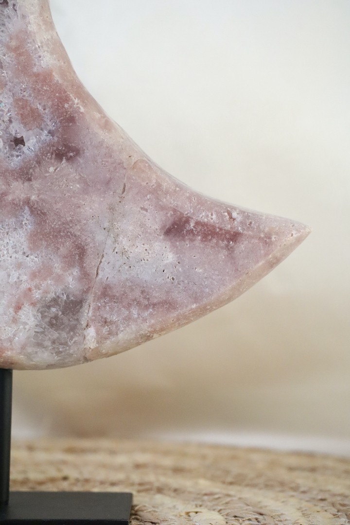 Deze indrukwekkende Amethist met Roze Chalcedoon maan op standaard is een bijzonder groot en karaktervol natuurstuk. De maanvorm is krachtig en vloeiend tegelijk, met een harmonieus samenspel van zachte roze chalcedoon en amethiststructuren. Het oppervlak toont natuurlijke kleurnuances, kristallijne delen en een rustige, matte glans die de steen een verfijnde uitstraling geeft.