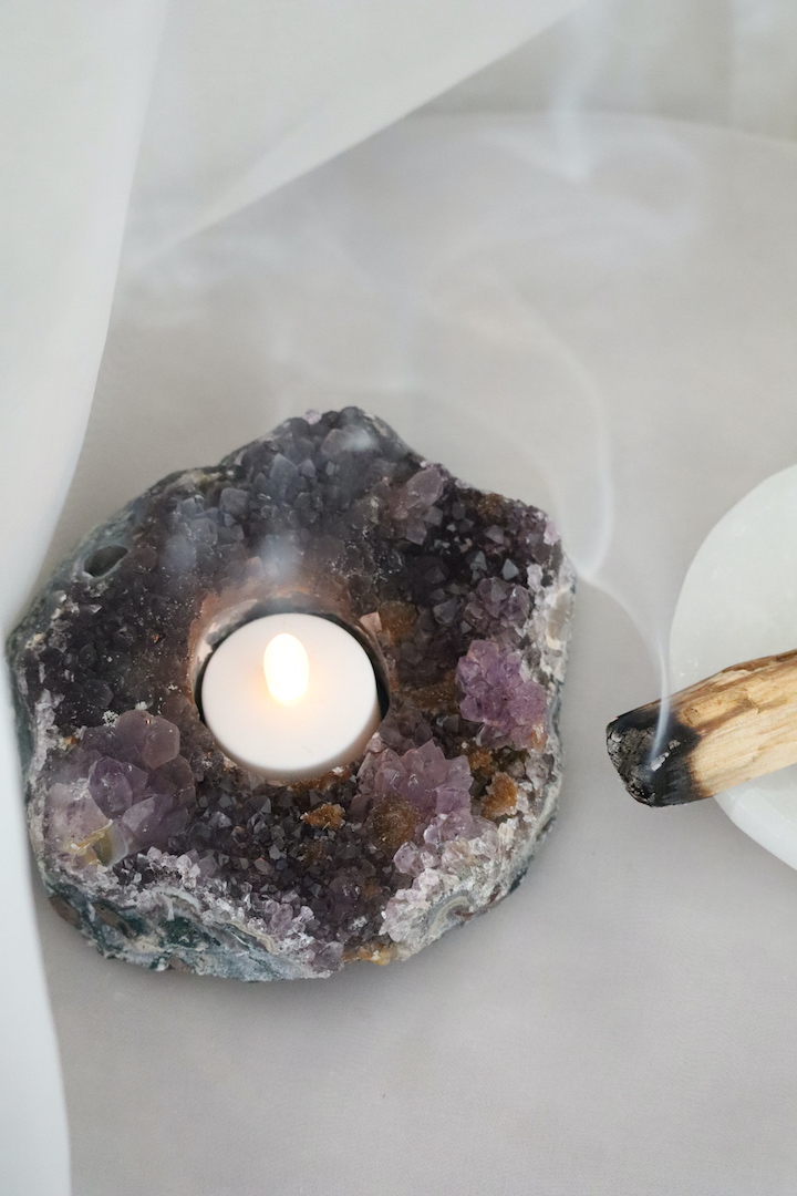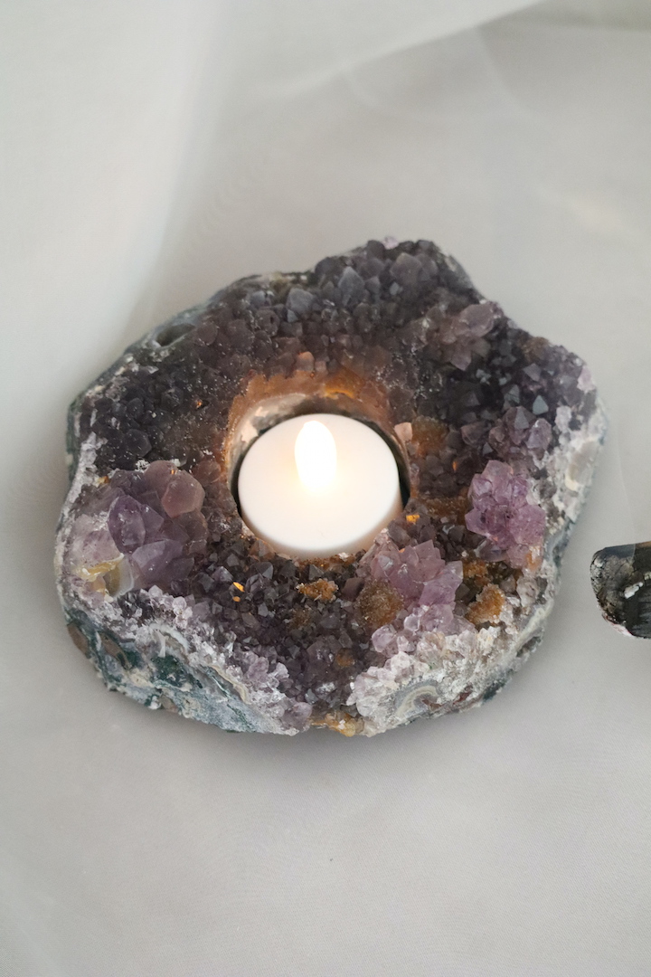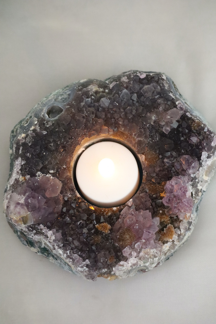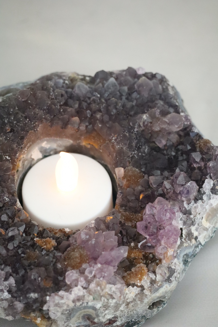 Amethist Theelichthouder met Limoniet – Aarding, zuivering en gouden lichtenergie