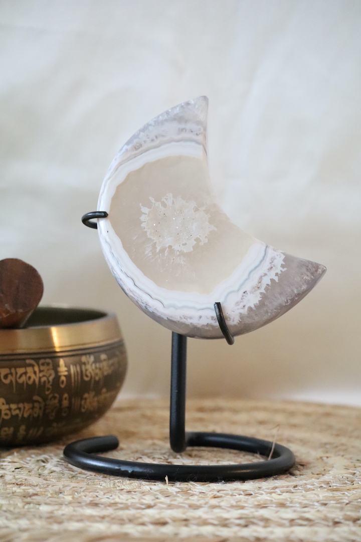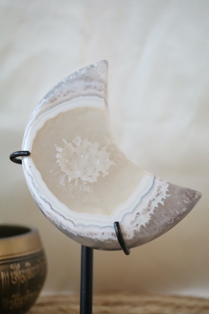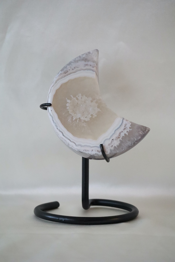 Een bijzondere druzy agaat maan op standaard met een zacht kristalmidden, zeldzame lichte banding en zichtbaar kwarts aan de achterzijde. Verfijnd natuurstuk van 402 gram (16,5 x 10 cm).