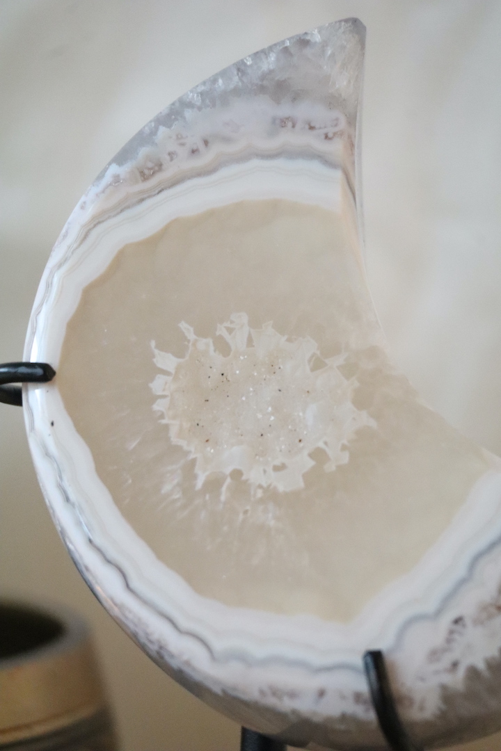 Druzy agaat maan op standaard met licht kristalmidden, zeldzame lichte banding en kwartsstructuur, 402 gram.