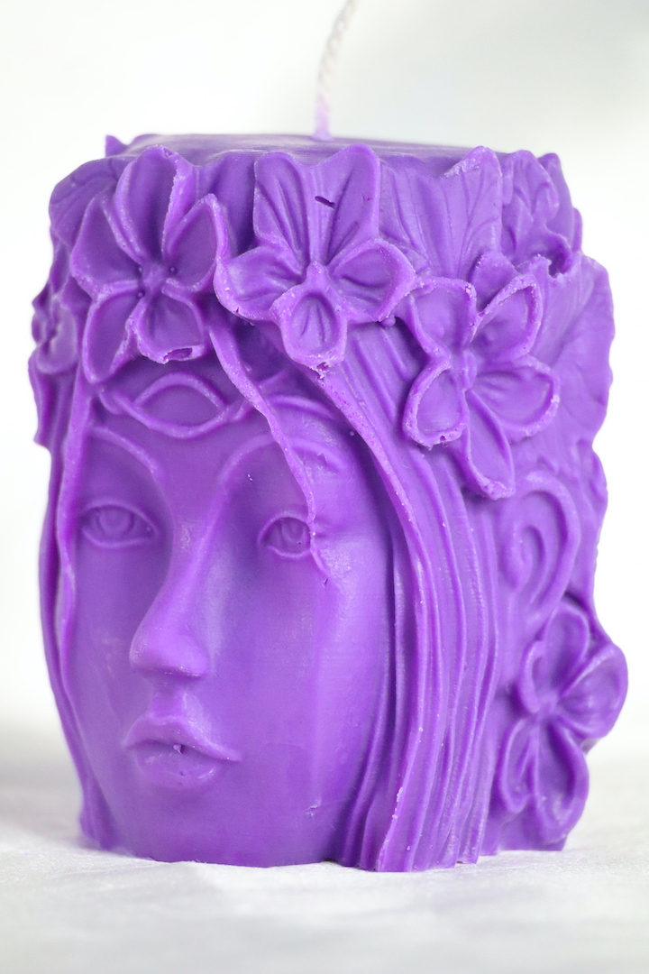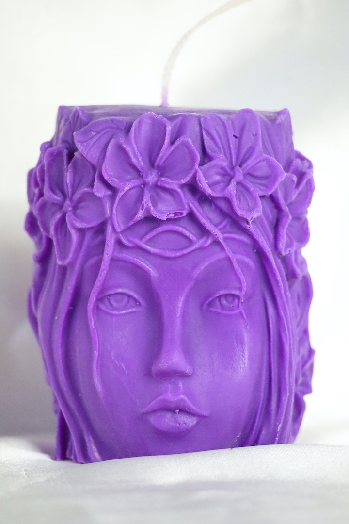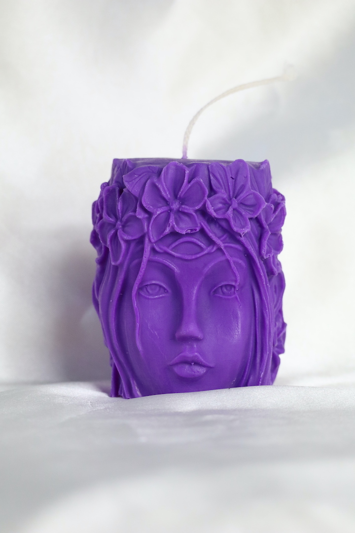De kaars is 8 x 7 cm groot, weegt 195 gram en straalt in werkelijkheid een zachte lila-paarse tint uit — een kleur die vaak wordt geassocieerd met spirituele helderheid, creativiteit en verbinding met het hogere. De gedetailleerde bloemenkroon en het serene, vrouwelijke gezicht zijn niet zomaar decoratieve elementen; ze symboliseren innerlijke bloei, intuïtieve wijsheid en het openen van je eigen energetische veld voor rust en inspiratie.