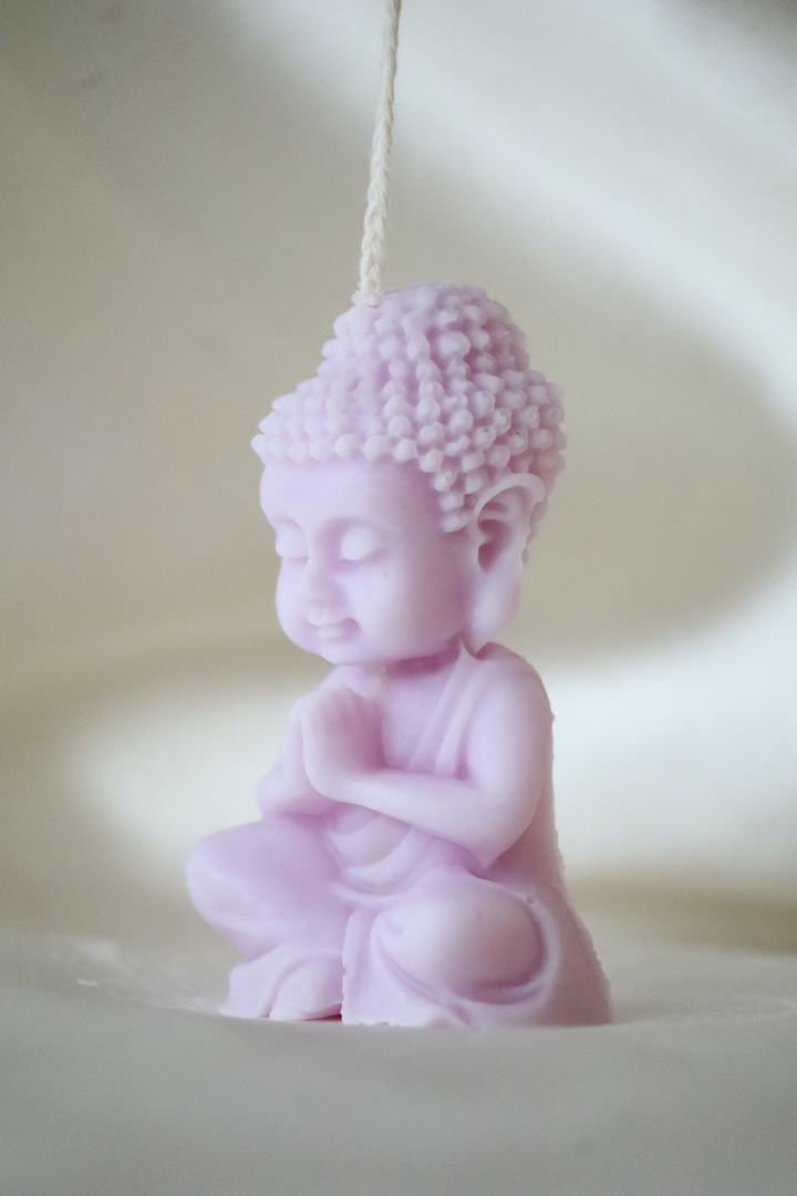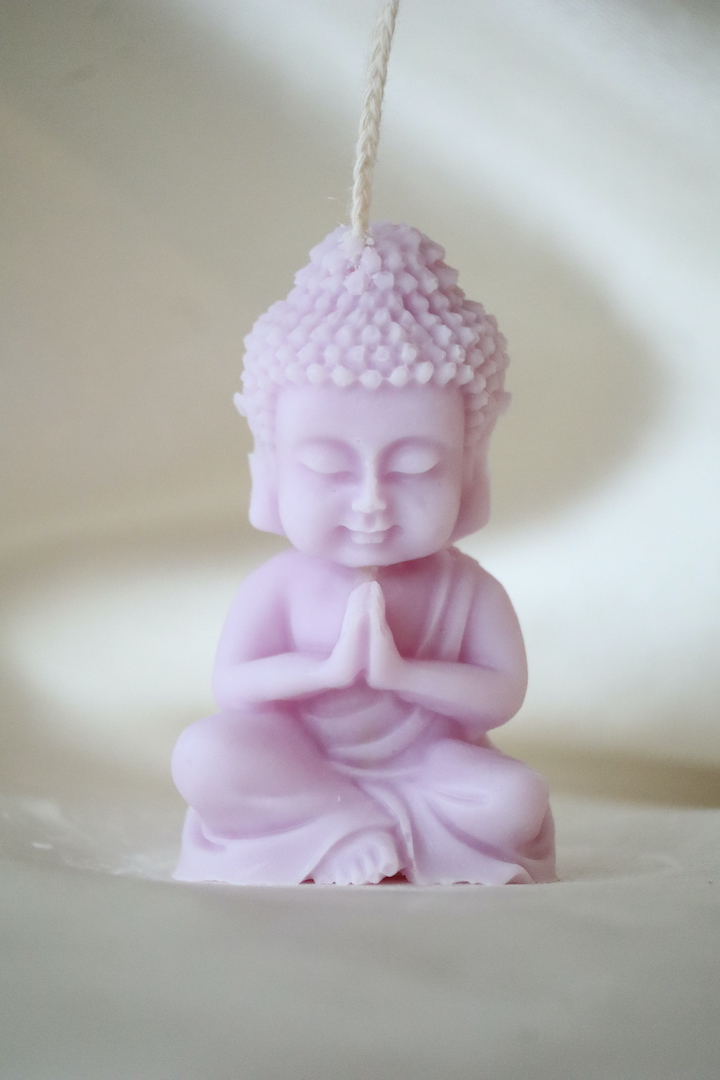 Lichtpaarse Boeddha Kaars van Europese soja- en lijnzaadwas. 20 g • 6 × 3,5 cm • brandtijd ca. 1,5–2,5 uur • 100% katoenen lont. Een zacht, symbolisch sculptuur voor rust, meditatie en innerlijke helderheid. Altijd op een schaaltje branden.