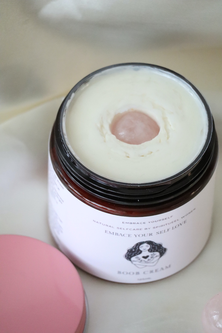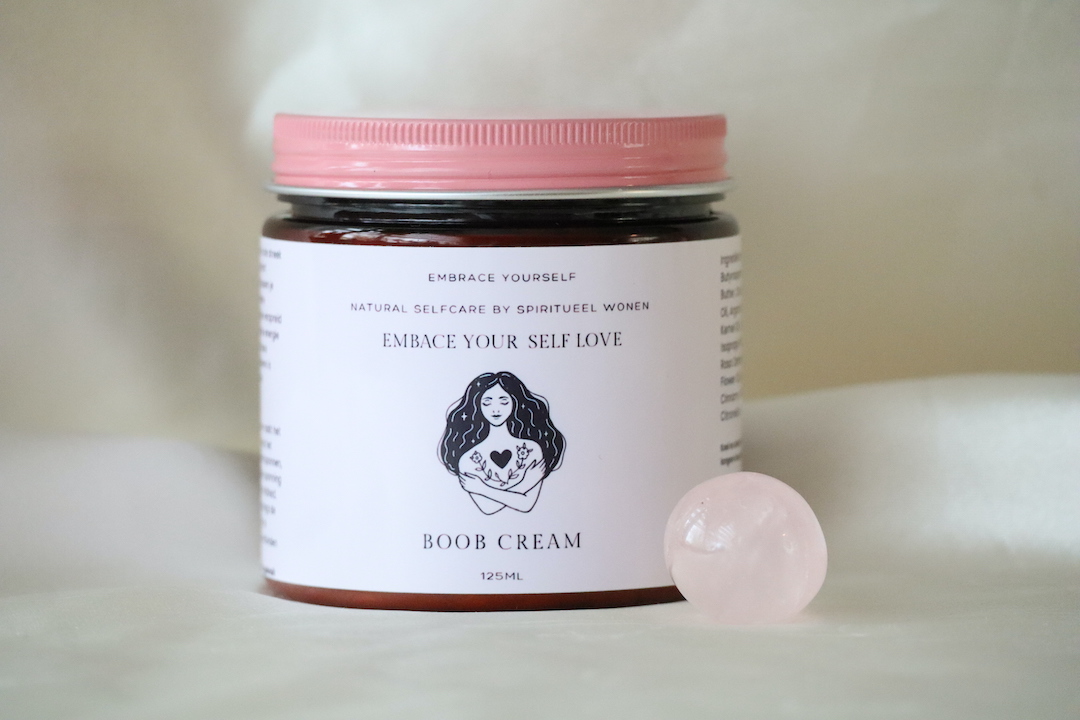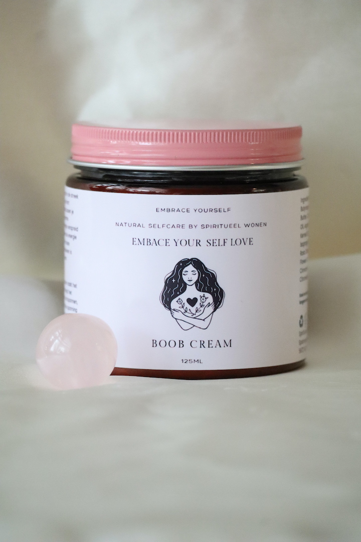 Deze Boob Cream maakt deel uit van de Embrace Your Self Love lijn van Spiritueel Wonen — een collectie die draait om zachtheid, zelfcompassie en het thuiskomen in je eigen lichaam.