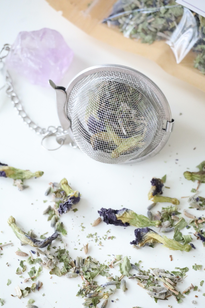 De melange bestaat uit lavendel, blauwe vlindererwt, citroenverbena, witte salie en steranijs – vijf kruiden die in harmonie samenwerken om helderheid, balans en spirituele focus te bevorderen.
