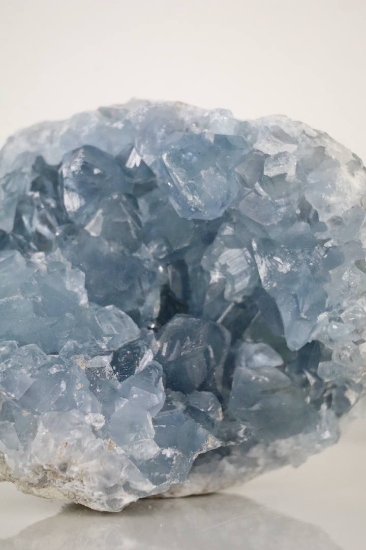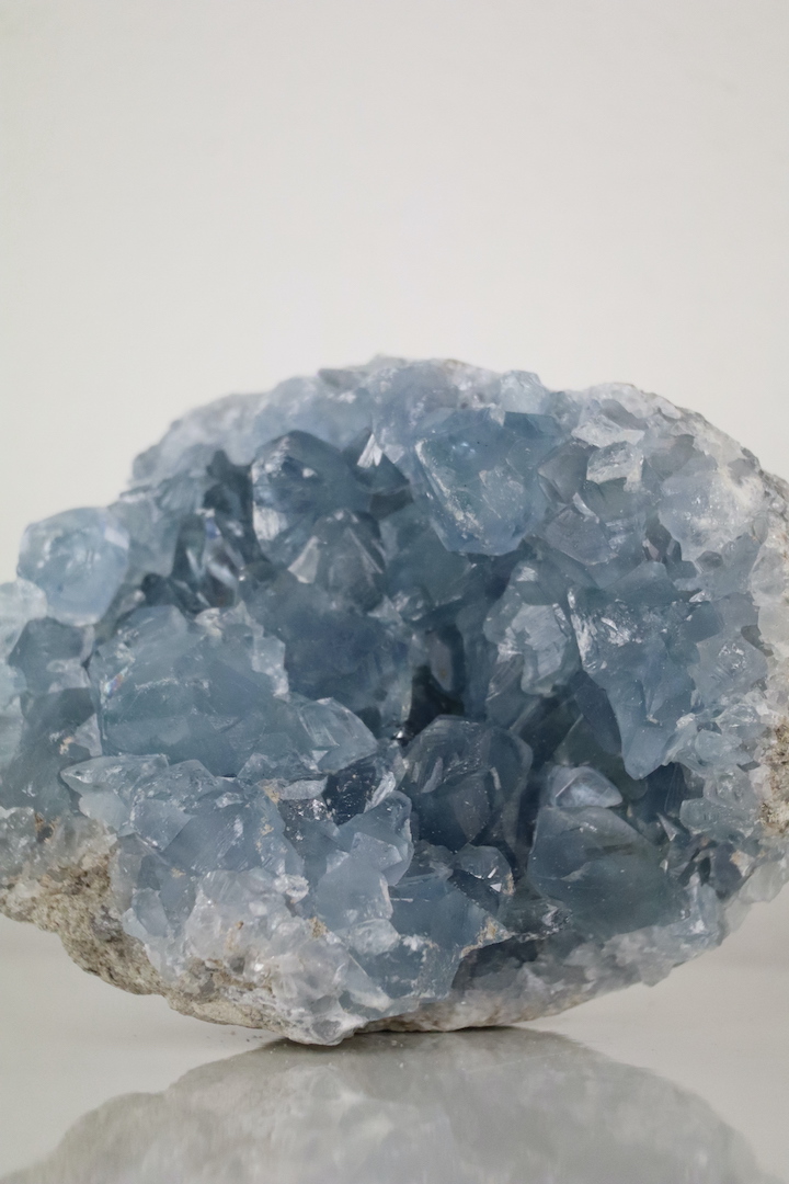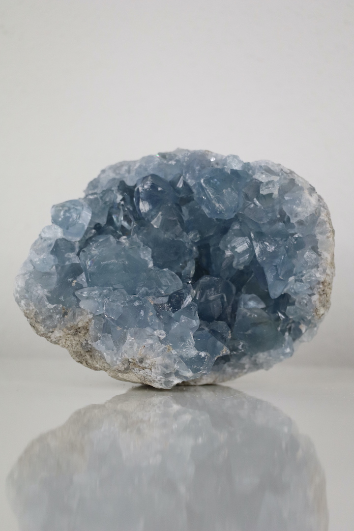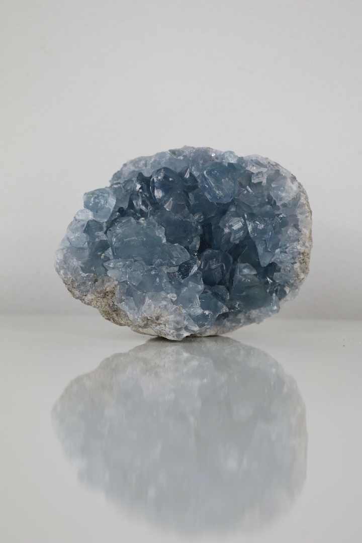 Deze Celestien cluster in klein formaat is een betoverend kristal vol zachtheid en licht. Met haar zachte hemelsblauwe kleur en delicate kristalstructuur brengt ze een kalme, troostende energie in elke ruimte. Afkomstig uit het mineraalrijke Madagaskar, draagt deze cluster de puurheid van de natuur en de kracht van eeuwenoude aarde in zich.