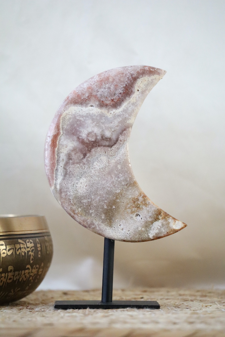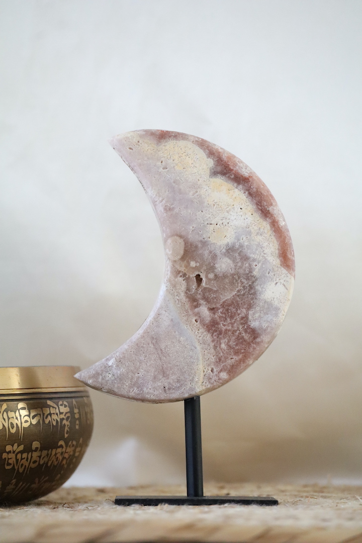 De maan staat al eeuwenlang symbool voor ritme, verstilling en innerlijke wijsheid. In woonruimtes wordt de maan vaak gekozen als vorm die uitnodigt tot vertraging en reflectie. Deze Chalcedoon maan herinnert op subtiele wijze aan het belang van luisteren naar jezelf en meebewegen met natuurlijke cycli — zonder nadruk, maar met aanwezigheid.