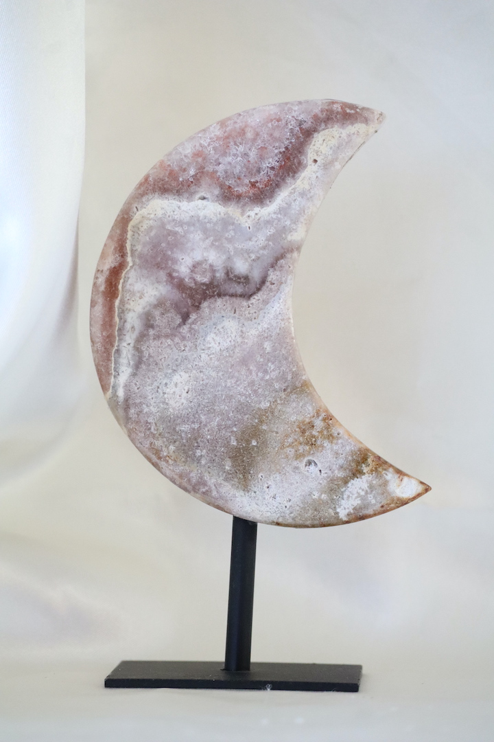 Deze Chalcedoon maan met kwarts is een elegant en ingetogen object dat rust en zachtheid brengt in elke ruimte. De maanvorm is met zorg geslepen en laat een harmonieus samenspel zien van zachte roze-, beige- en crèmetinten, afgewisseld met natuurlijke kwartsinsluitsels. Geplaatst op een slanke, zwarte metalen standaard ontstaat een verfijnd geheel dat zowel decoratief als betekenisvol is.