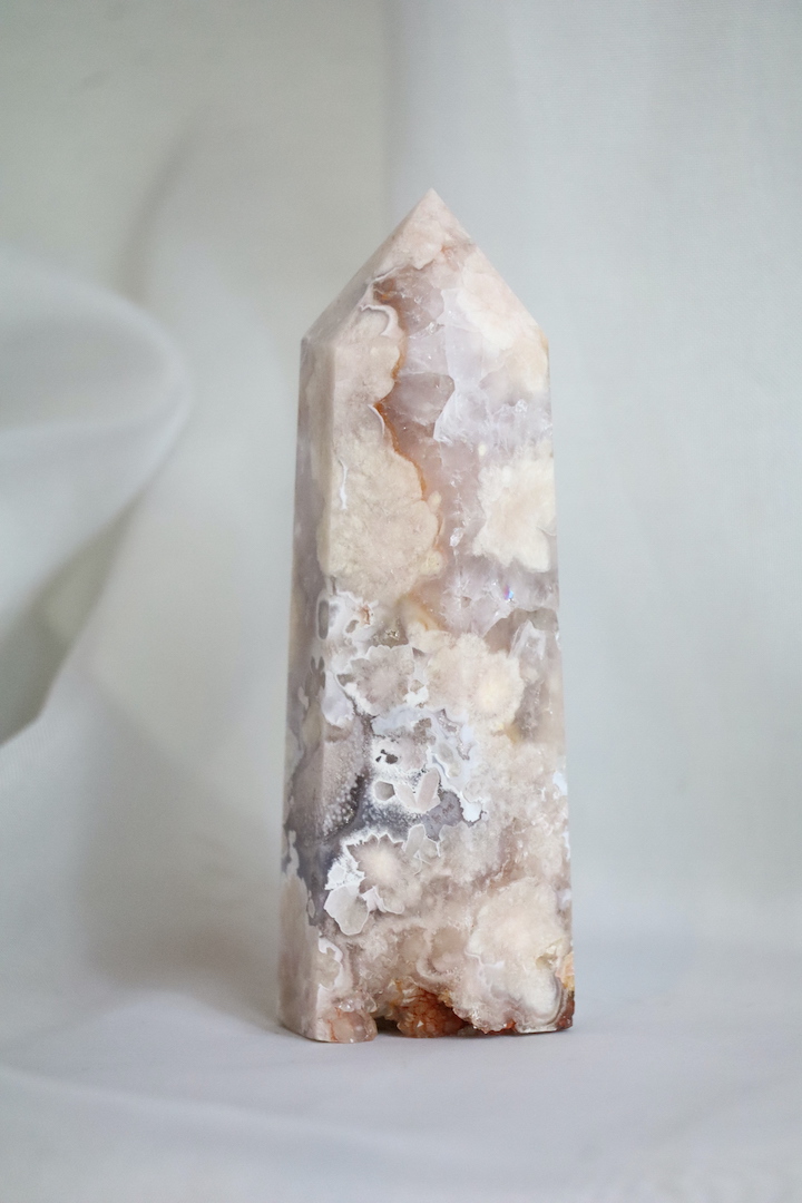 Deze Chalcedoon met Bloemagaat toren is een klein kunstwerk dat de natuur in al haar zachtheid laat zien. De steen voelt als een verstild landschap; zachte crème- en zandtinten vloeien samen met bloemvormige agaatstructuren die bijna lijken op gedroogde bloesems, gevangen in kristal.