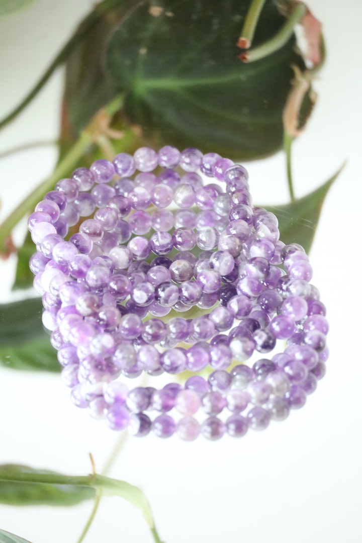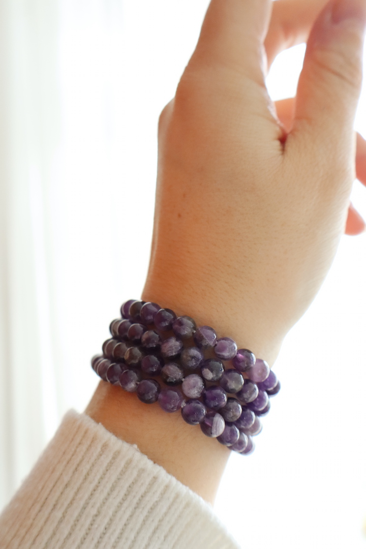 Elke kraal is anders. De intensiteit van het paars en de hoeveelheid witte banden varieert per armband. Dat maakt elk exemplaar uniek en authentiek.