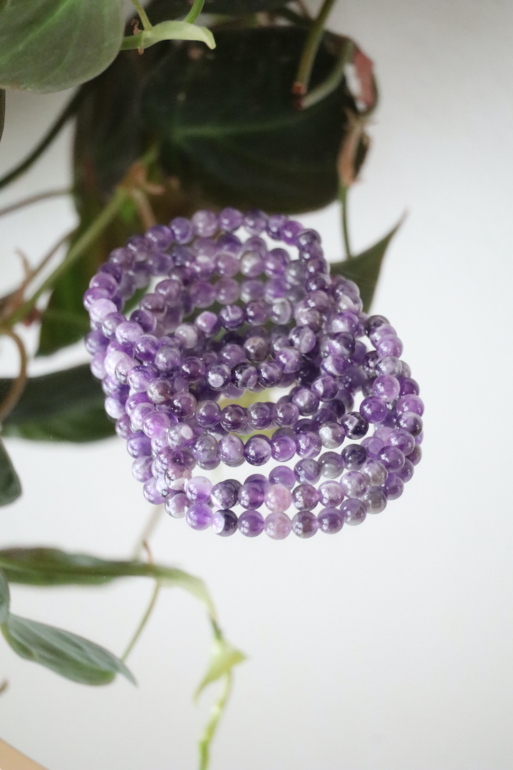 Chevron Amethist armband met 6 mm kralen. Een rustgevende edelsteen armband met natuurlijke paarse en witte banden. Bekijk ook onze klassieke Amethist armband hier.