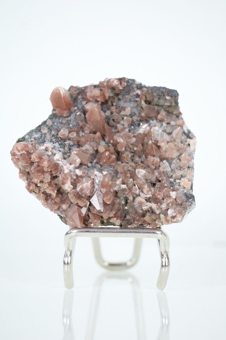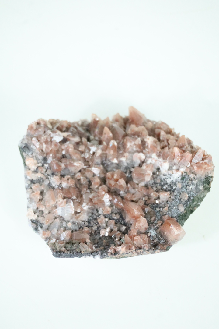 Het cluster is opgebouwd uit talloze kleine Calcietpunten in de herkenbare dogtooth-vorm (hondentand). De warme chocoladebruine kleur wordt veroorzaakt door hematietinsluitsels in de Calciet, wat zorgt voor een rijke en aardse uitstraling. Het oppervlak is levendig en sprankelend, waardoor het cluster vanuit elke hoek iets nieuws laat zien.