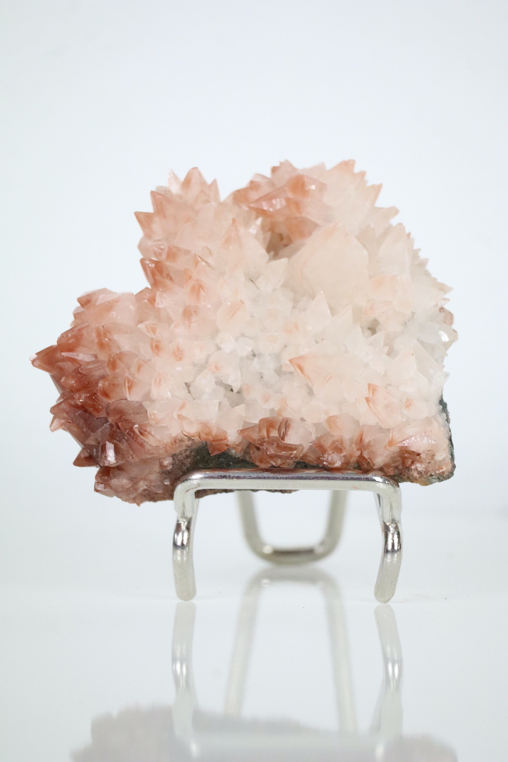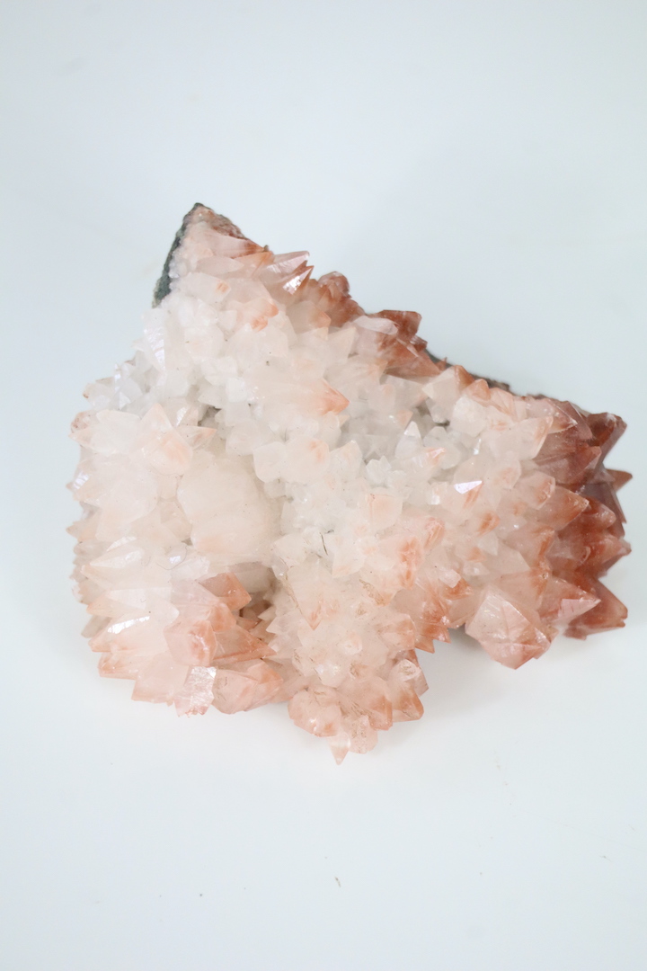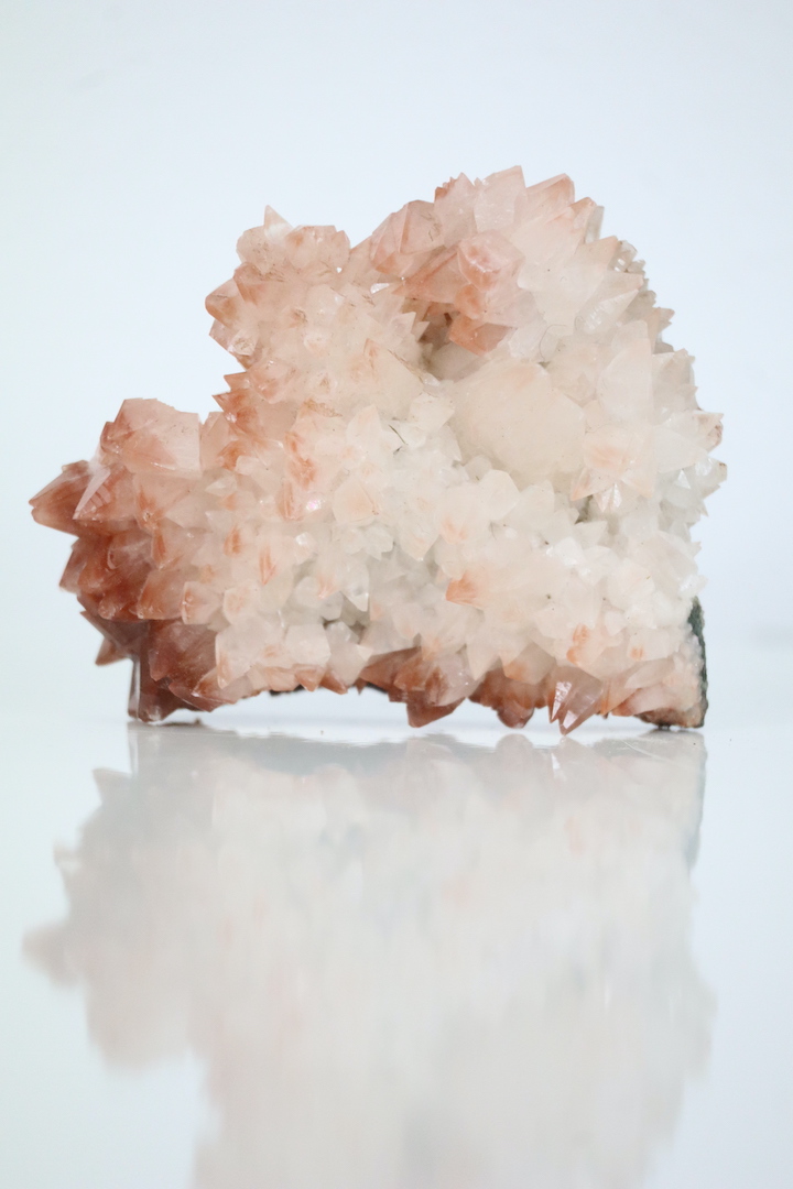 Wat dit cluster zo bijzonder maakt, is het prachtige kleurverloop. Aan de basis zijn de Calcietpunten diep bruinrood door hematietinsluitsels, terwijl ze naar de punt toe overgaan in een zachte, bijna melkachtige wit-transparante tint. Dit natuurlijke verloop geeft het cluster een dynamische, bijna schilderachtige uitstraling.