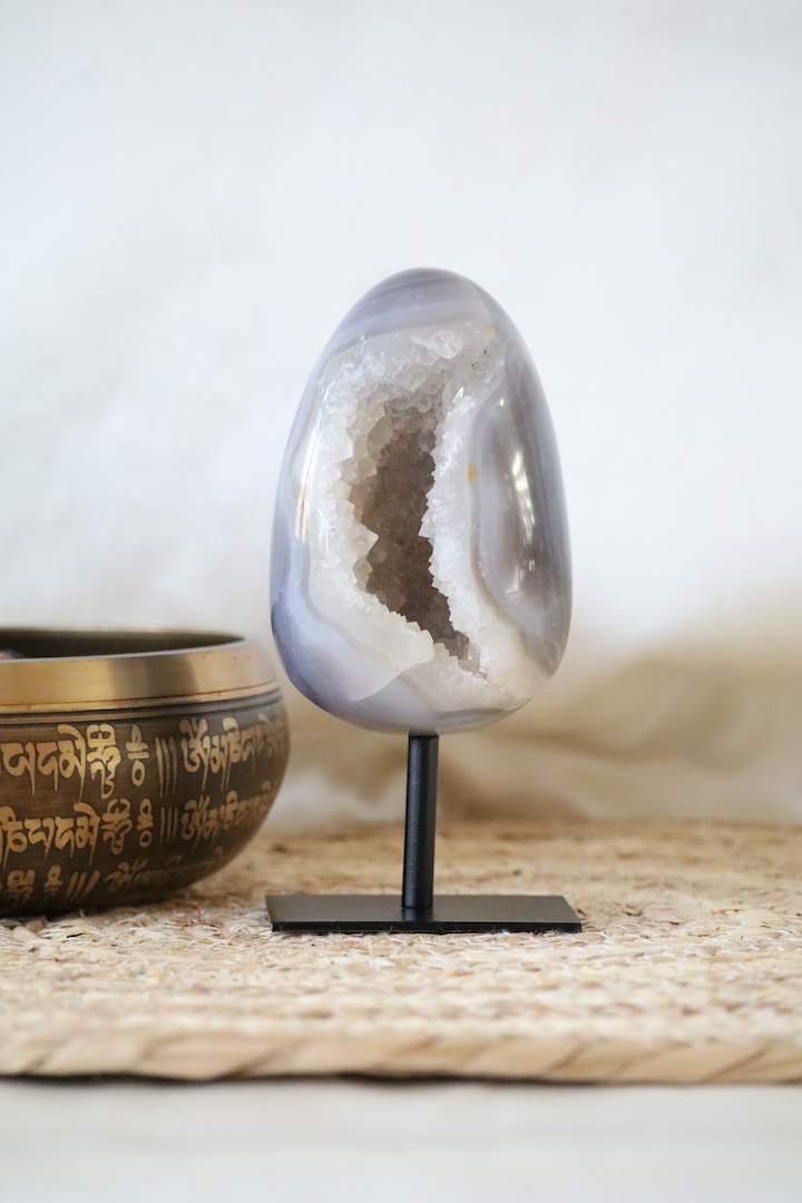 De ei-vorm staat symbool voor nieuw begin, zachtheid en potentie. In combinatie met agaat — een steen die vaak wordt gekozen om stabiliteit en rust te ondersteunen — ontstaat een object dat uitnodigt tot vertraging en verstilling. Dit maakt het druzy agaat ei zeer geschikt voor een plek waar je tot rust wilt komen, zoals een slaapkamer, meditatiehoek of rustige werkruimte.