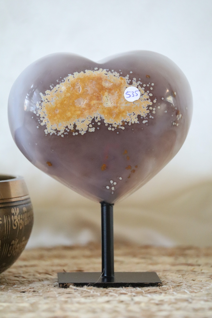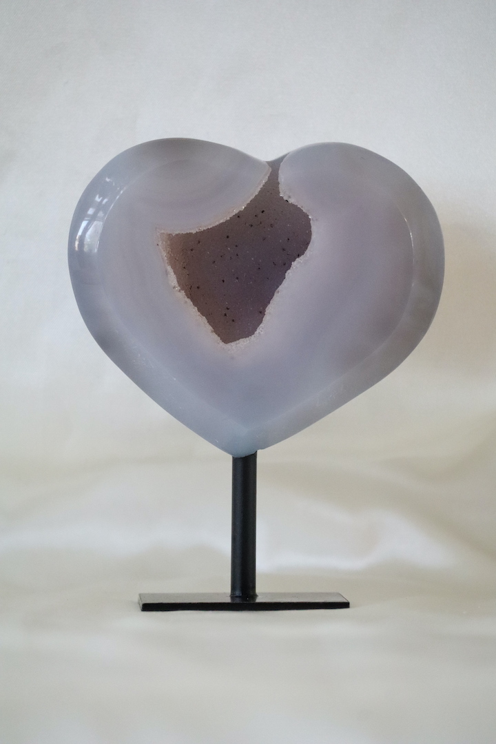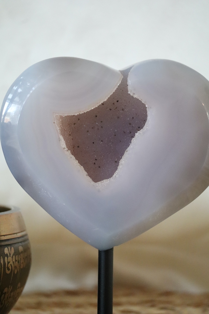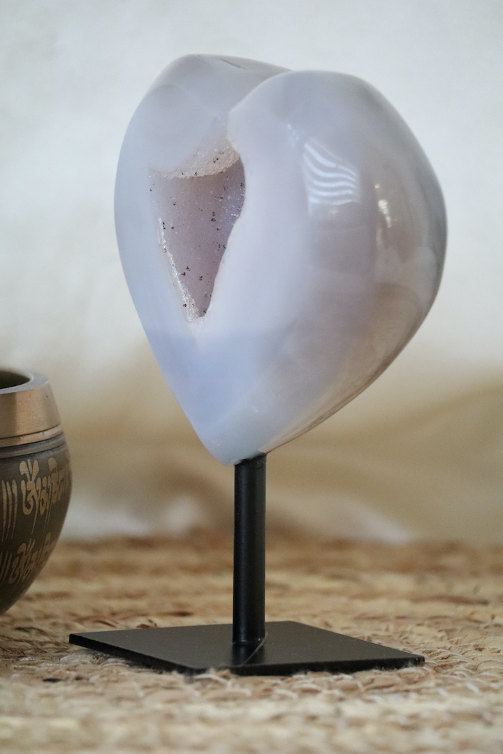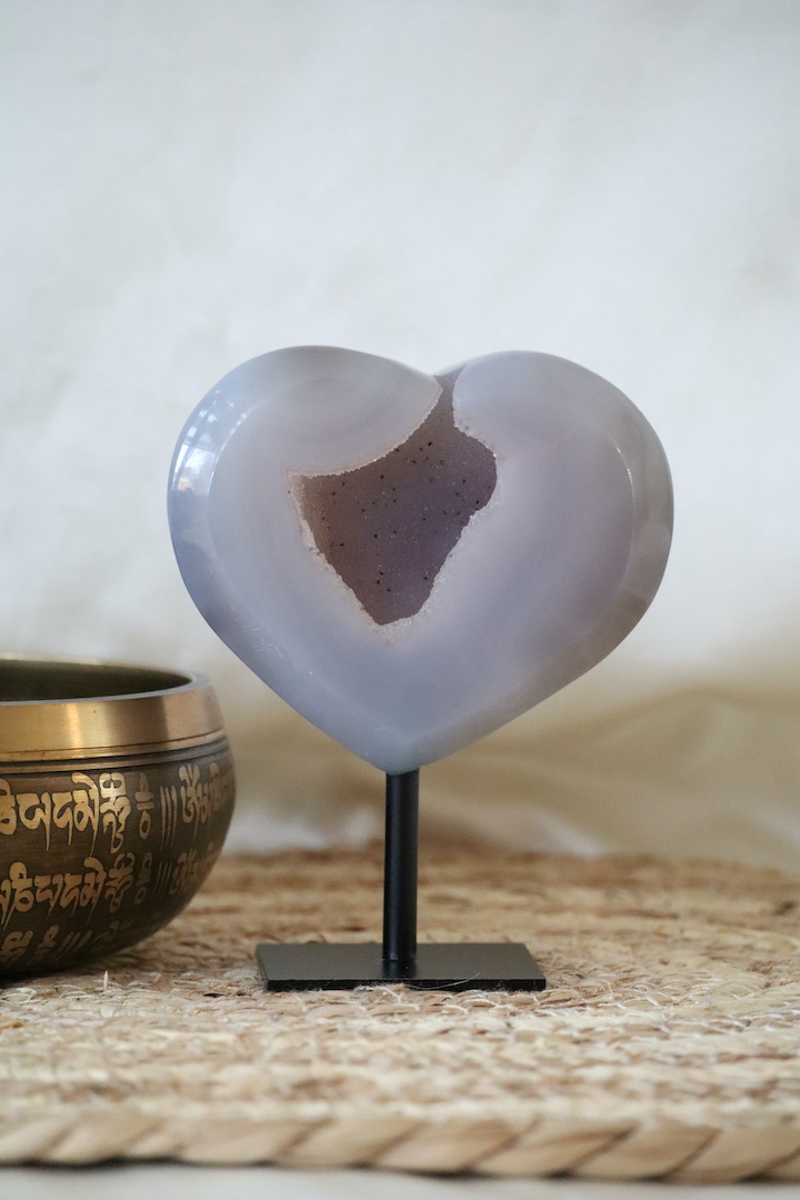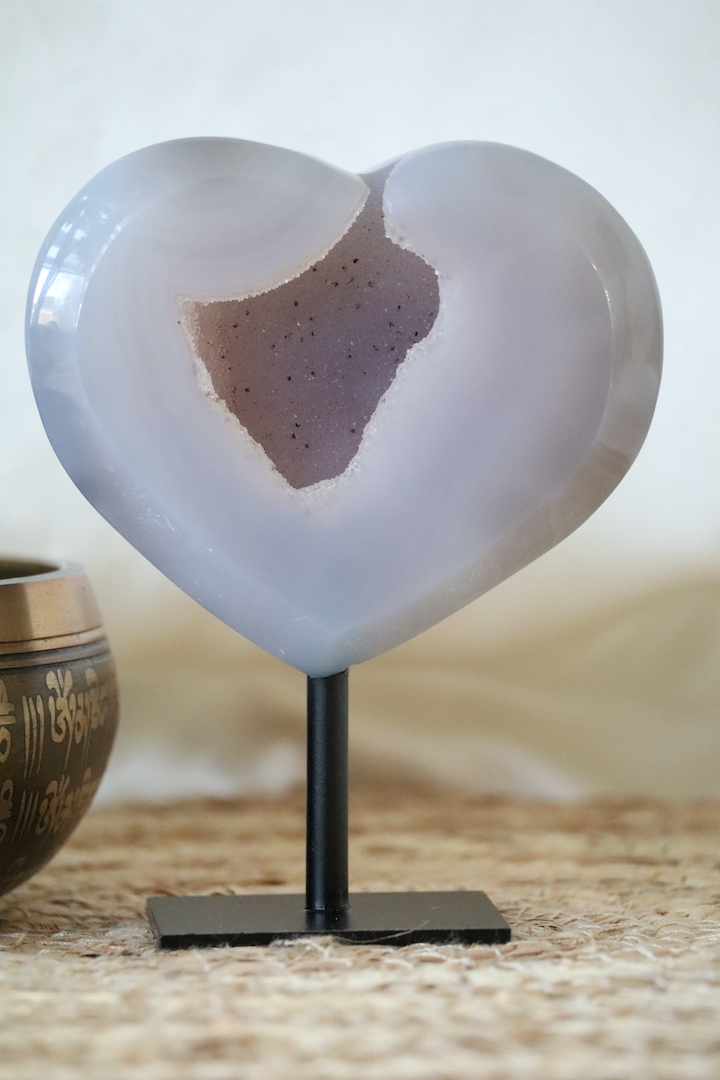 De hartvorm staat symbool voor zachtheid, verbinding en balans. In combinatie met agaat — een steen die vaak wordt gekozen om stabiliteit en rust te ondersteunen — ontstaat een object dat uitnodigt tot vertraging en verstilling. Dit maakt het druzy agaat hart bijzonder geschikt voor een slaapkamer, woonkamer, meditatiehoek of praktijkruimte.
