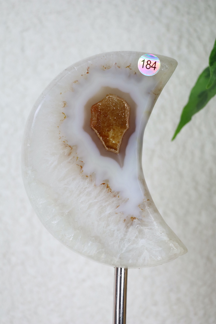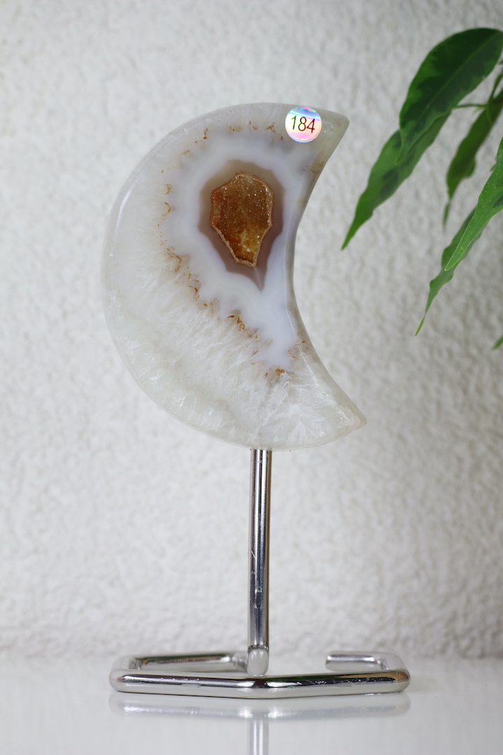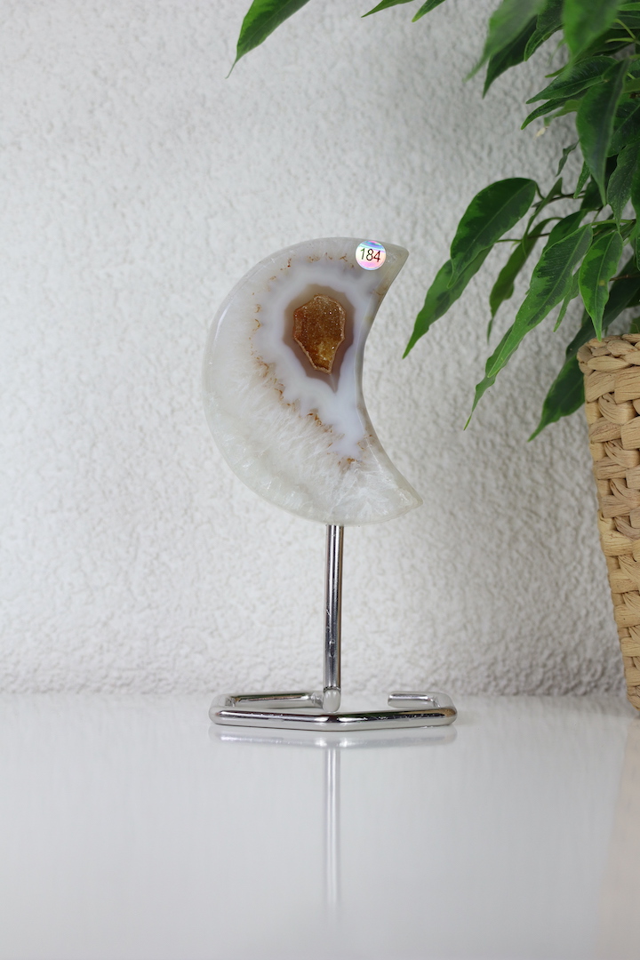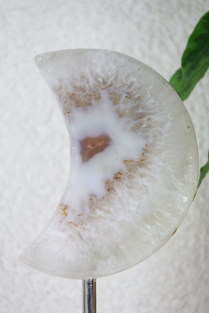 Druzy Agaat Kwarts Maan op standaard met opvallende oranje druzy. Deze maan straalt vrouwelijke kracht, creativiteit en intuïtie uit. Een blikvanger én energetisch anker voor jouw ruimte.