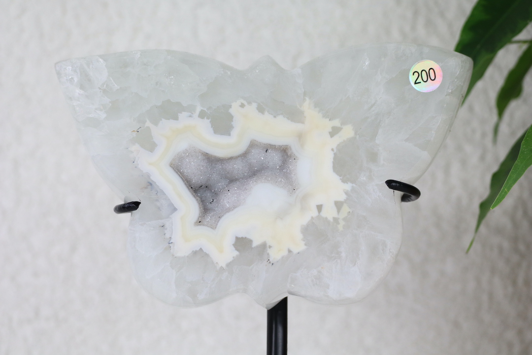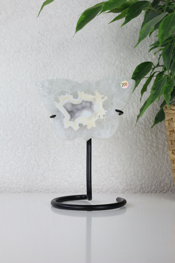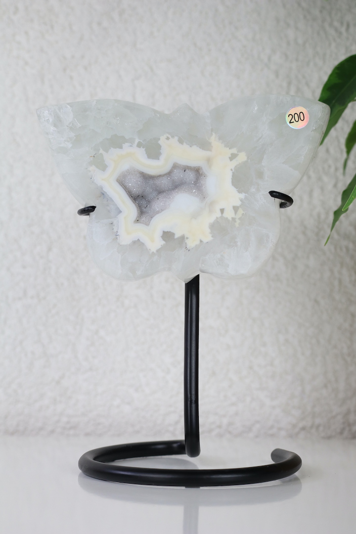 Prachtige Druzy Agaat Kwarts Vlinder op standaard, een krachtig symbool van transformatie en vrijheid. Het druzy gedeelte versterkt de energie van Agaat en Kwarts, waardoor deze vlinder een ideale metgezel is voor meditatie, energetische reiniging en spirituele heling.