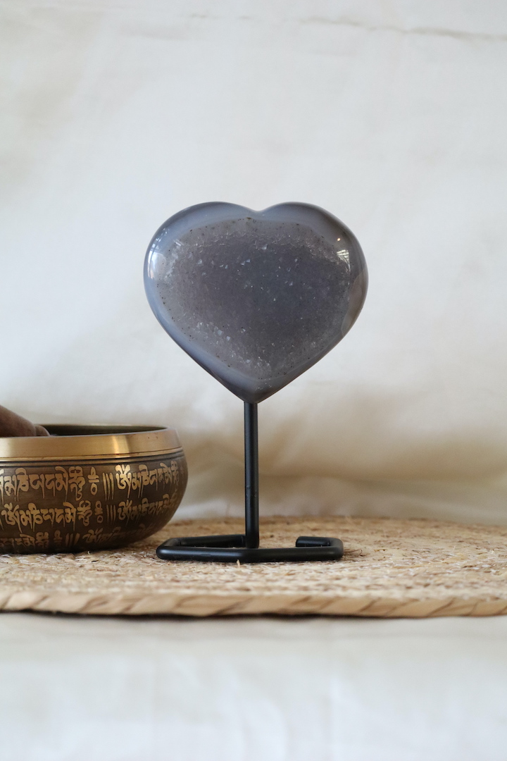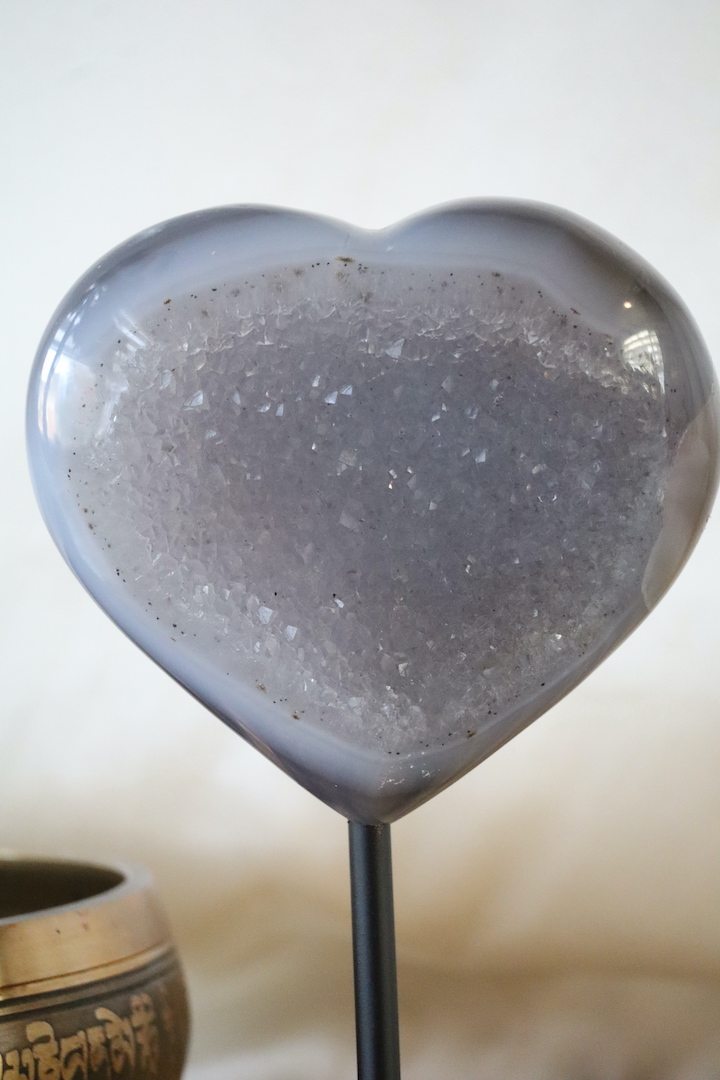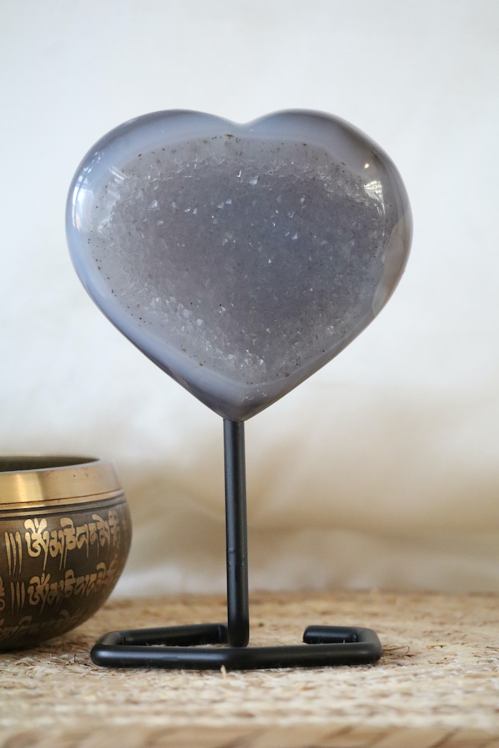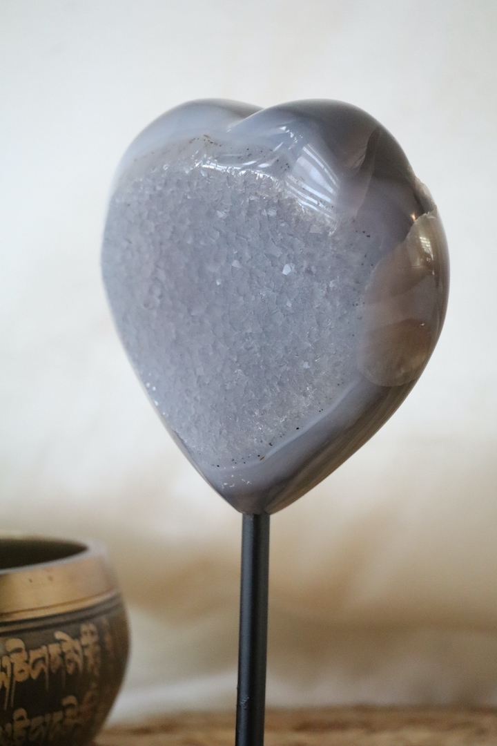 Het druzy agaat hart is geplaatst op een minimalistische metalen standaard, waardoor het mooi rechtop staat en optimaal tot zijn recht komt. De standaard is sober en tijdloos, zodat alle aandacht naar het natuurstuk gaat. Hierdoor krijgt het geheel een sculpturale uitstraling, zonder zijn zachte karakter te verliezen.