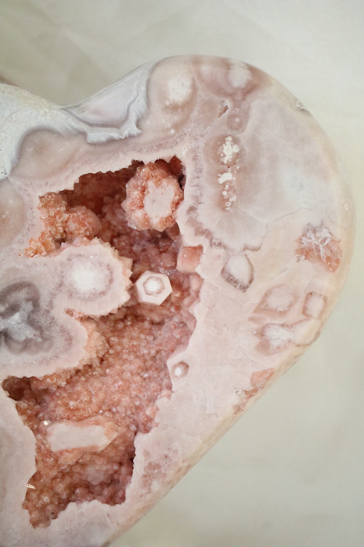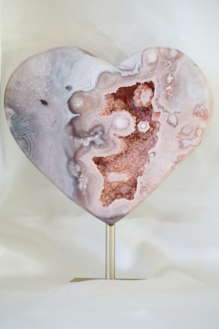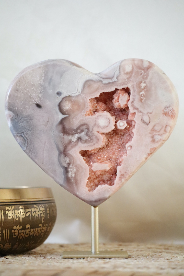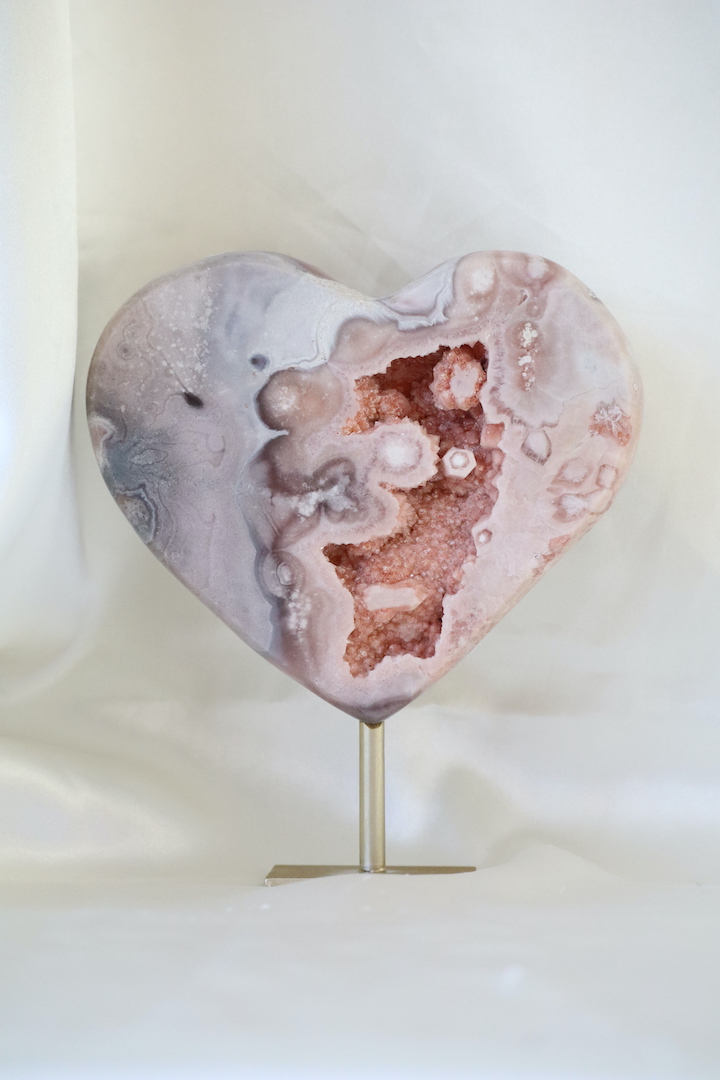 Chalcedoon wordt traditioneel geassocieerd met rust, balans en een kalme emotionele sfeer. De hartvorm versterkt de symboliek van verbinding en zachtheid. De druzy-structuur voegt een heldere, verfijnende kwaliteit toe, wat dit stuk bijzonder geschikt maakt voor ruimtes waar je wilt vertragen en tot jezelf wilt komen.