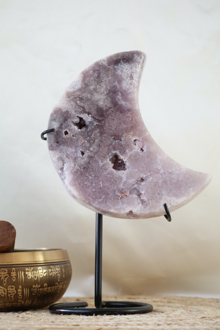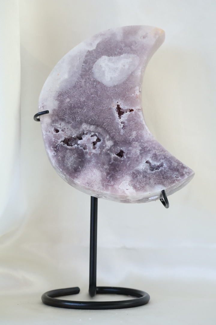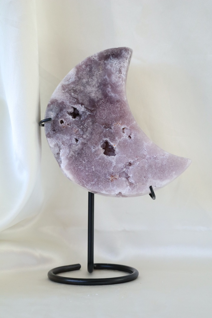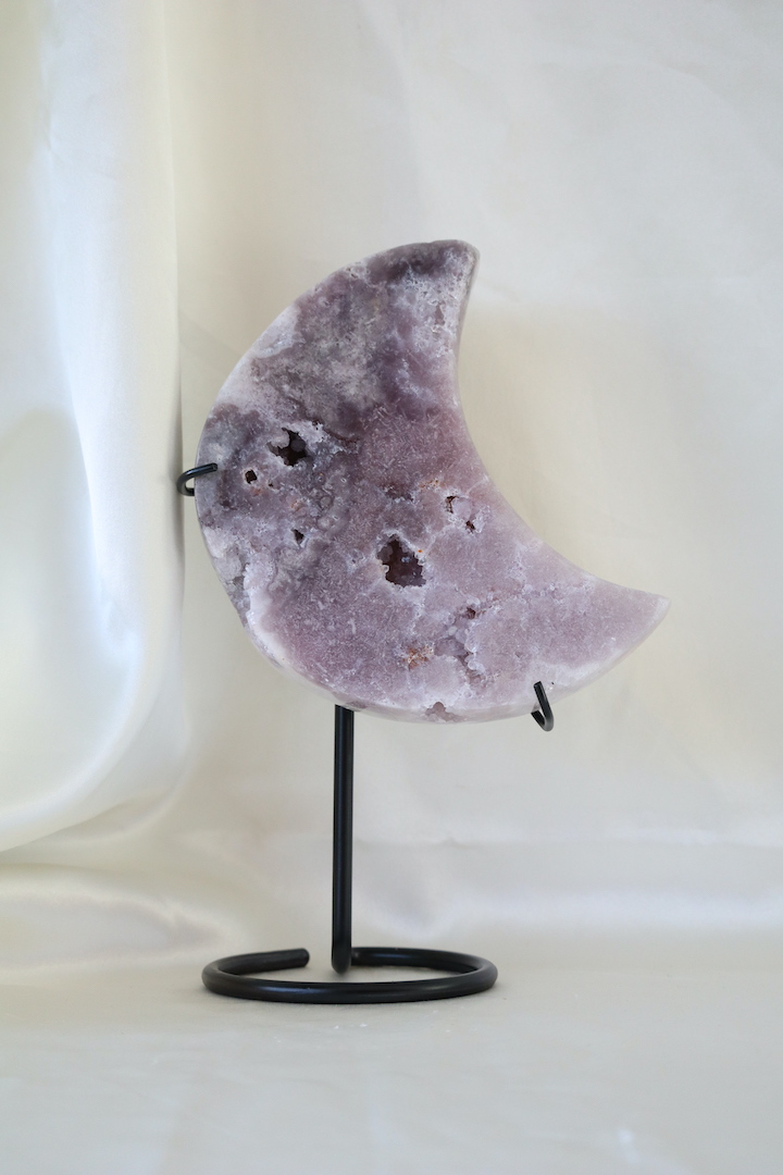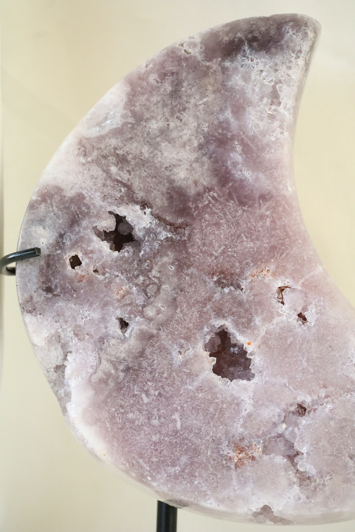 Deze Druzy Paarse Chalcedoon maan op standaard is een indrukwekkend en karaktervol woonobject dat direct rust en diepte uitstraalt. De maan is rijk van formaat en toont een subtiel spel van zachte paarse, lila en grijsroze tinten. Verspreid over het oppervlak zijn natuurlijke druzy-openingen zichtbaar, waarin kleine kristallen zorgen voor een verfijnde, ingetogen schittering.