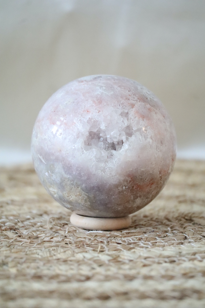 De basis van deze bol bestaat uit roze chalcedoon, herkenbaar aan zijn melkachtige, licht doorschijnende structuur en zachte roze tot beige tinten. De kleur is ingetogen en natuurlijk, met hier en daar warme nuances die het geheel diepte geven. Roze chalcedoon staat bekend om zijn rustige uitstraling en wordt vaak gekozen voor ruimtes waar zachtheid en balans gewenst zijn.