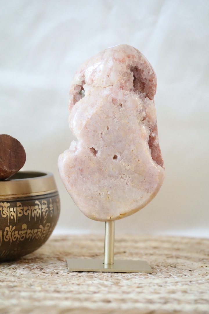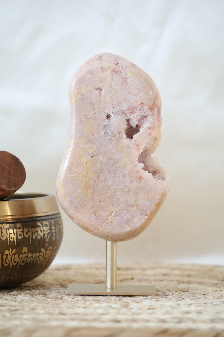 Roze chalcedoon wordt traditioneel geassocieerd met zachtheid, emotionele balans en innerlijke rust. De druzy-structuur van kwarts voegt een heldere, verfijnende kwaliteit toe en wordt vaak gezien als ondersteunend bij reflectie en het creëren van een rustige sfeer in huis.