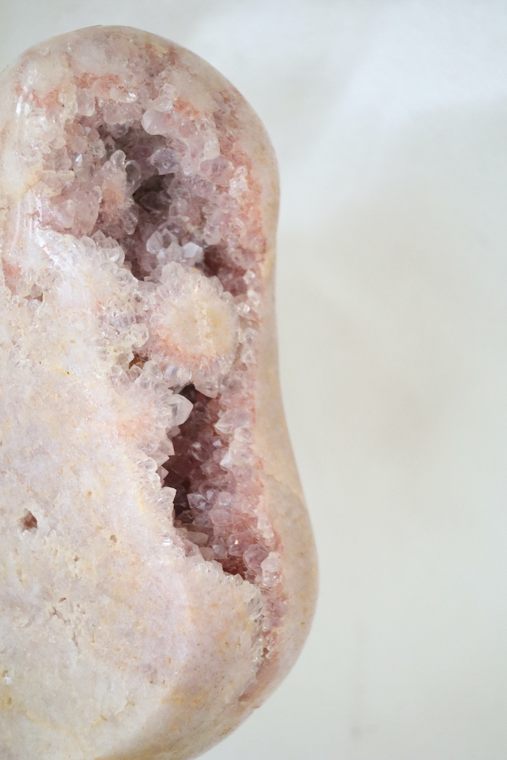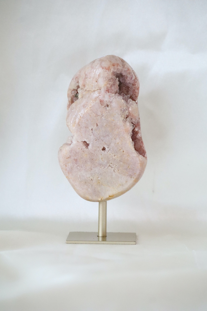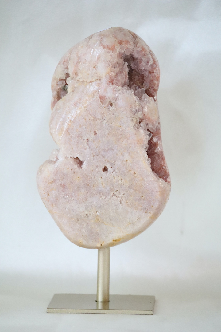 Roze chalcedoon staat bekend om haar melkachtige tot zijdeachtige oppervlak en zachte roze tinten. In dit exemplaar wordt de chalcedoon verrijkt door een druzy-formatie: een natuurlijke kristallaag van fijn kwarts die zich in open holtes heeft gevormd. Deze kristallen vangen het licht subtiel en geven het stuk een levendige, maar rustige uitstraling.