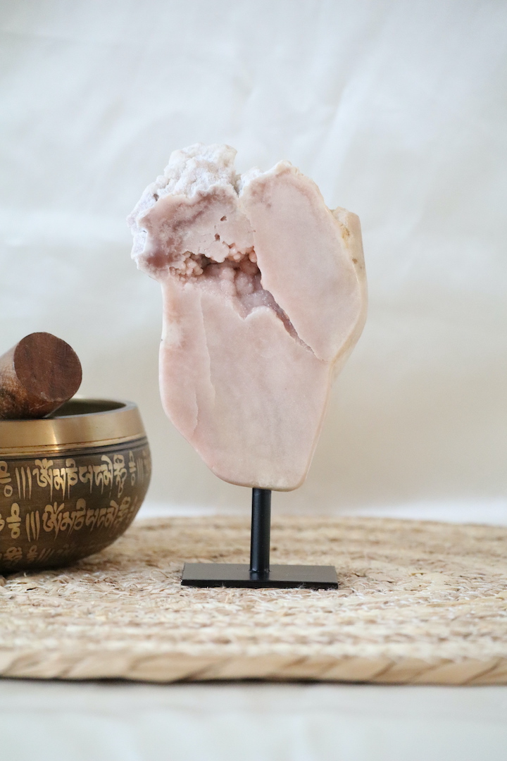 Roze chalcedoon wordt traditioneel geassocieerd met zachtheid, emotionele balans en innerlijke rust. De druzy-structuur van kwarts voegt een heldere, verfijnende kwaliteit toe en wordt vaak gezien als ondersteunend bij focus, reflectie en het bewust creëren van rust in een ruimte.