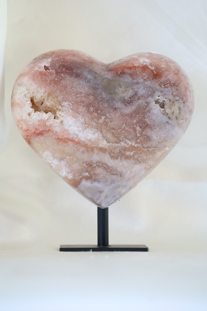 Dit gelaagde Roze Chalcedoon hart met kwarts is een zacht en krachtig symbool van balans, verbondenheid en verfijning. De hartvorm is zorgvuldig geslepen en laat prachtige natuurlijke lagen zien in nuances van poederroze, crème en warme aardetinten. In het hart van de steen zijn subtiele kwartsopeningen zichtbaar, die dit stuk extra diepte en karakter geven. Geplaatst op een slanke zwarte metalen standaard vormt het geheel een elegant en tijdloos woonobject.