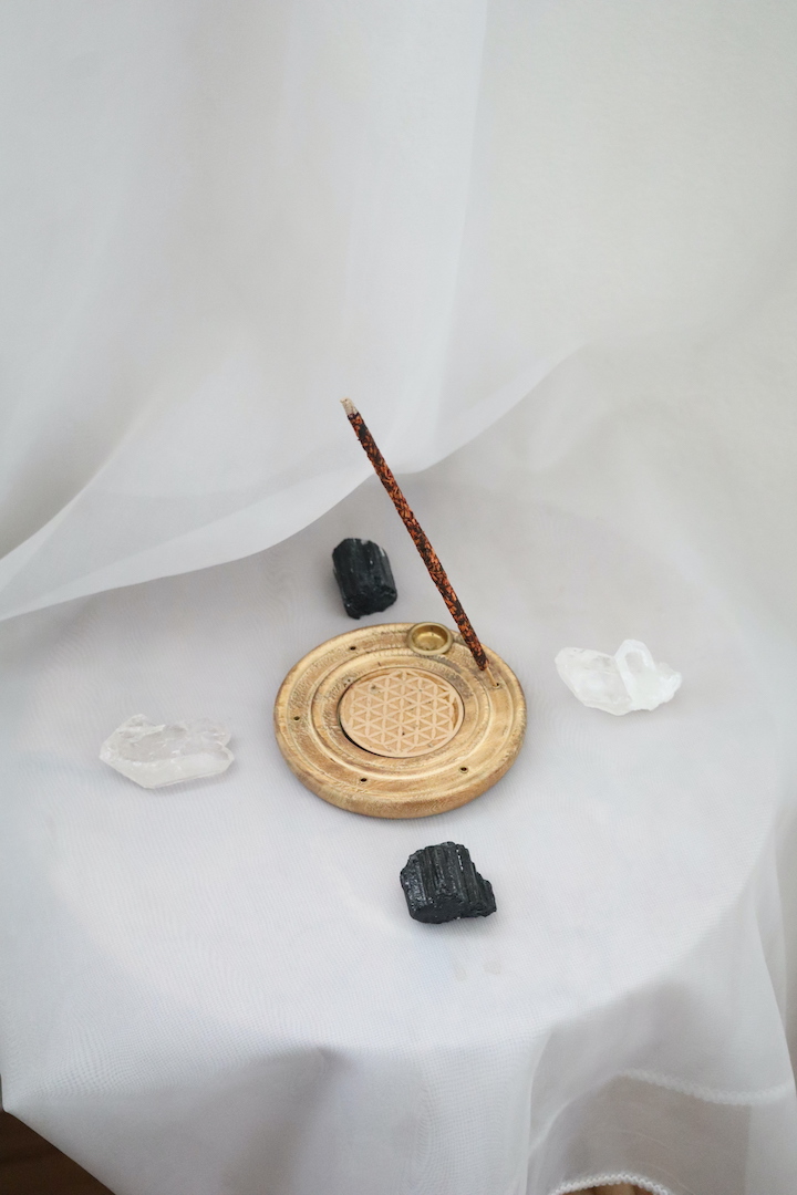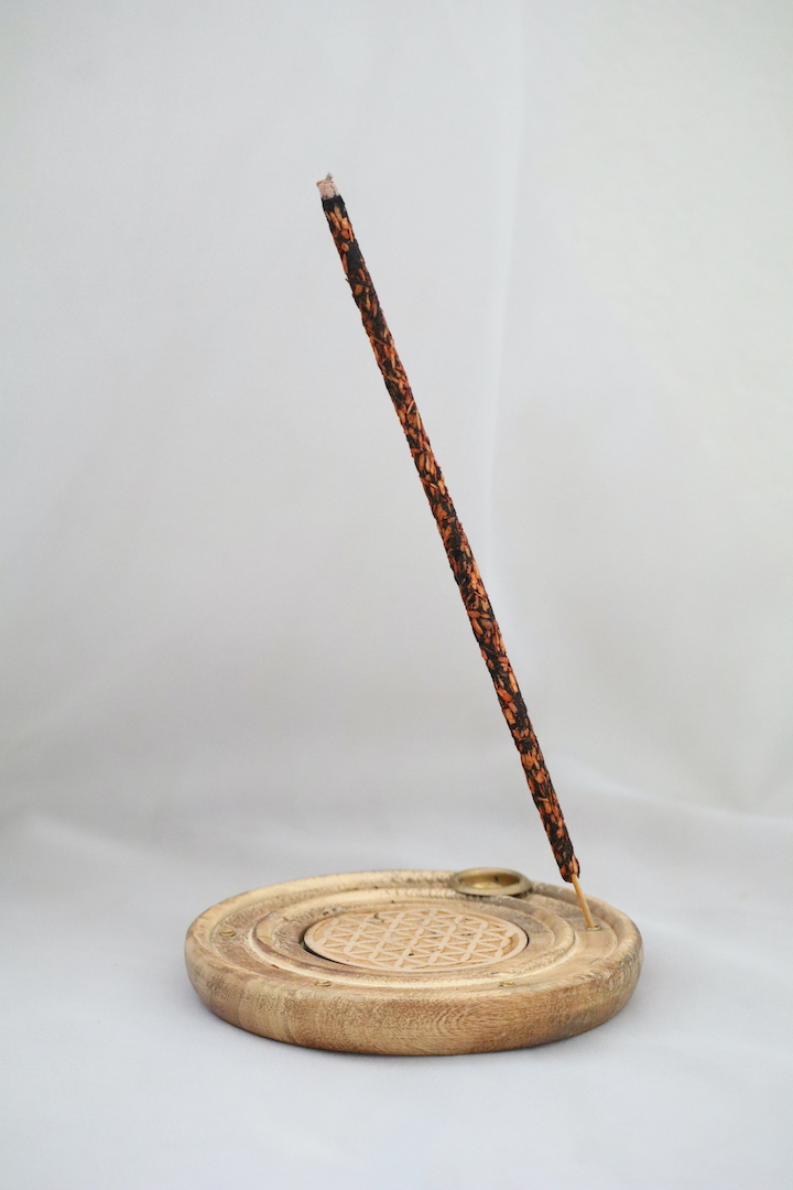 Een houten wierookhouder met het Flower of Life symbool – het symbool van scheppingskracht, harmonie en bescherming.