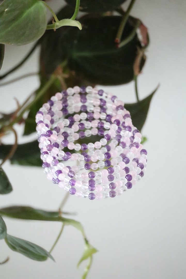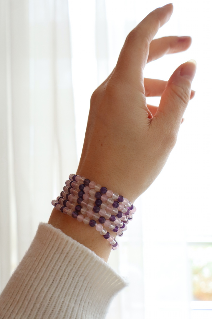 Elke steen is uniek. De tinten paars, roze en helder kunnen licht variëren in intensiteit. Dat maakt iedere armband een eigen samenstelling van de natuur.