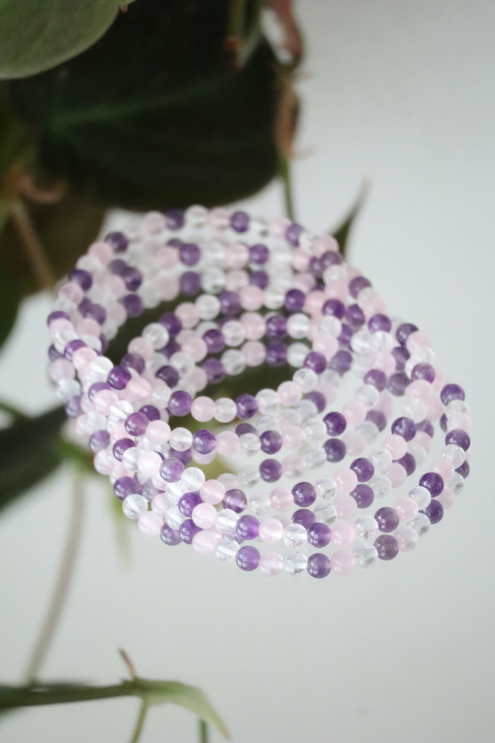 Deze Gouden Driehoek armband van 4 mm is een subtiele en elegante uitvoering van een van de meest geliefde edelsteencombinaties. De fijne kralen van Amethist, Rozenkwarts en Bergkristal vormen samen een zacht kleurenspel van paars, lichtroze en helder transparant.
