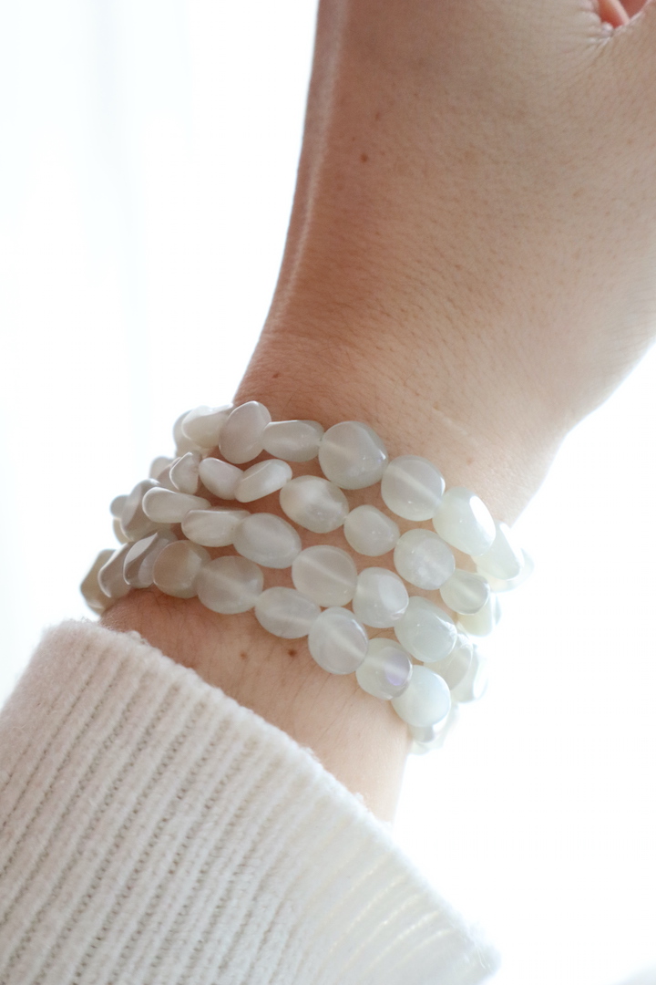 De kleur is subtiel groenwit met een melkachtige glans. In het licht zie je soms een zachte schittering die bijna parelmoerachtig oogt. Een armband die rust uitstraalt, zonder op te vallen.