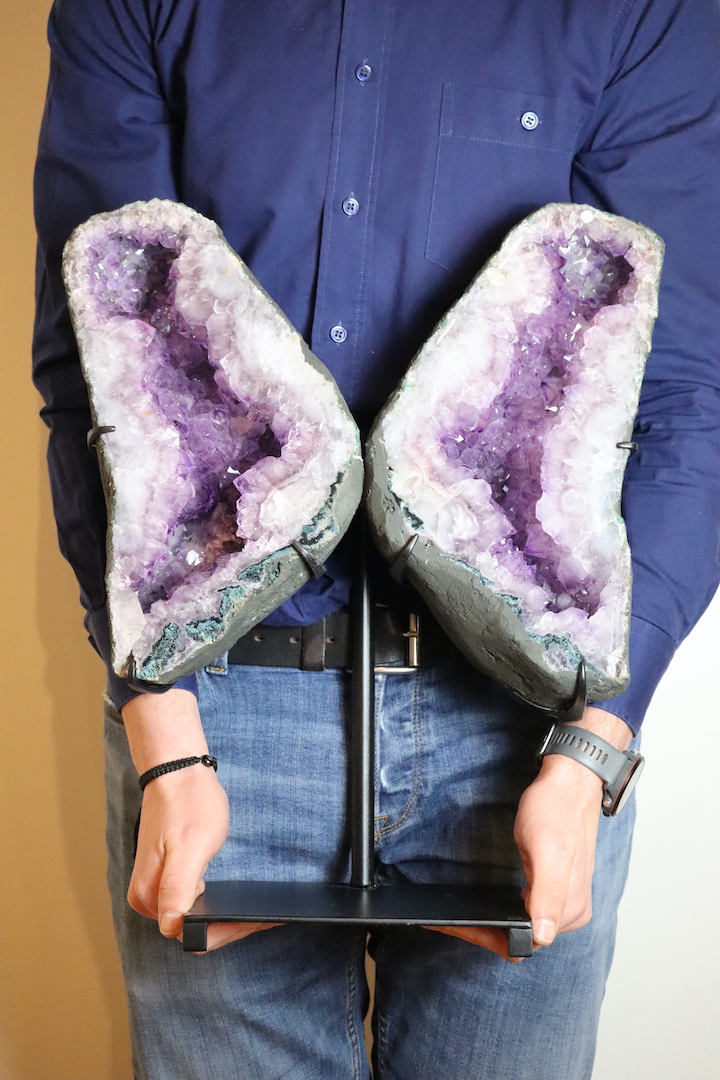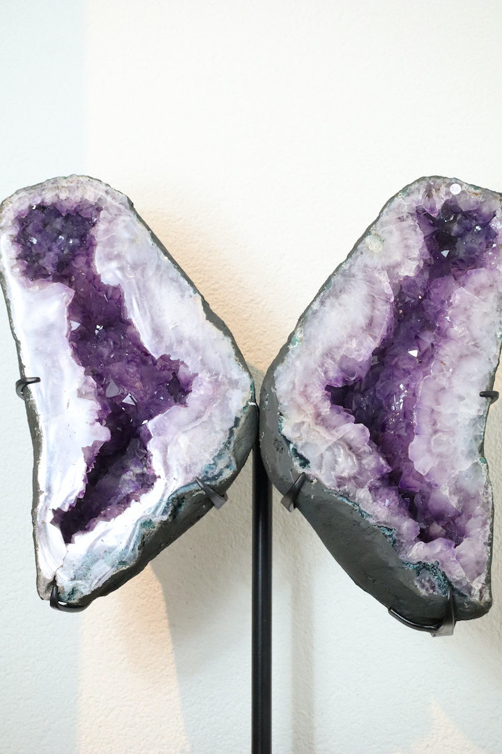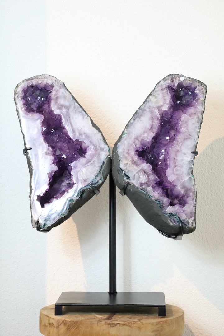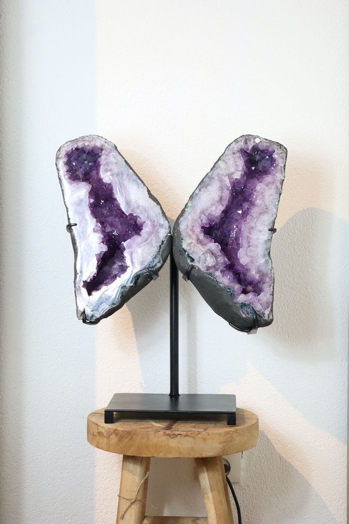 Dankzij de stevige, minimalistische standaard komt de Amethist perfect tot zijn recht als vrijstaand object. Plaats het stuk in de woonkamer, een praktijkruimte, meditatieruimte of ontvangsthal, waar het zowel als blikvanger als rustpunt fungeert. Door de vlindervorm nodigt dit object uit tot verstilling en reflectie, zonder dominant aanwezig te zijn.