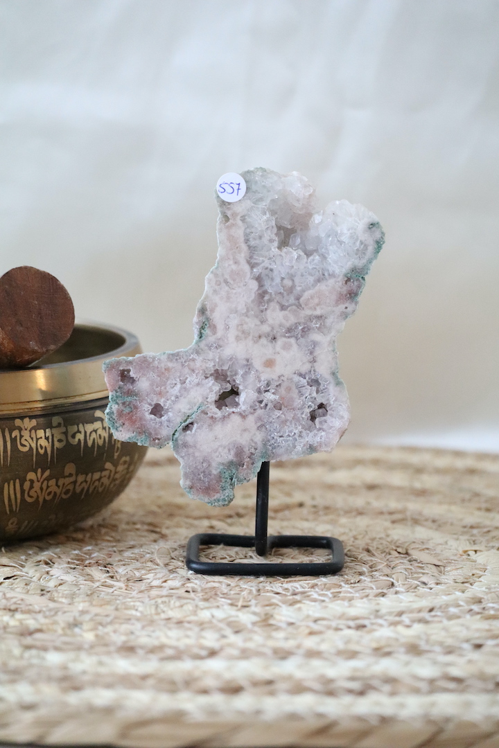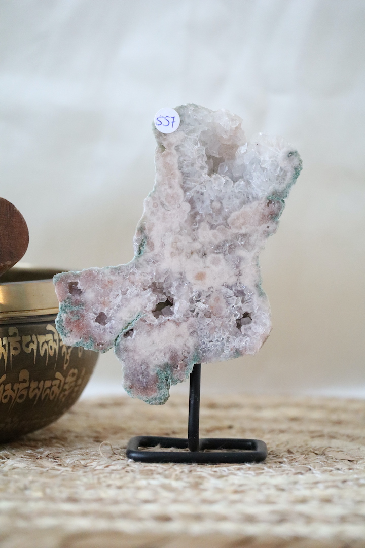 Deze kleine Roze Chalcedoon met Kwarts op standaard is een verfijnd en karaktervol natuurstuk waarin zachtheid en kristallijne structuur elkaar op een rustige manier ontmoeten. De lichtroze chalcedoon vormt een kalme basis, terwijl de aanwezige druzy kwartsdelen zorgen voor subtiele diepte en een zachte schittering.