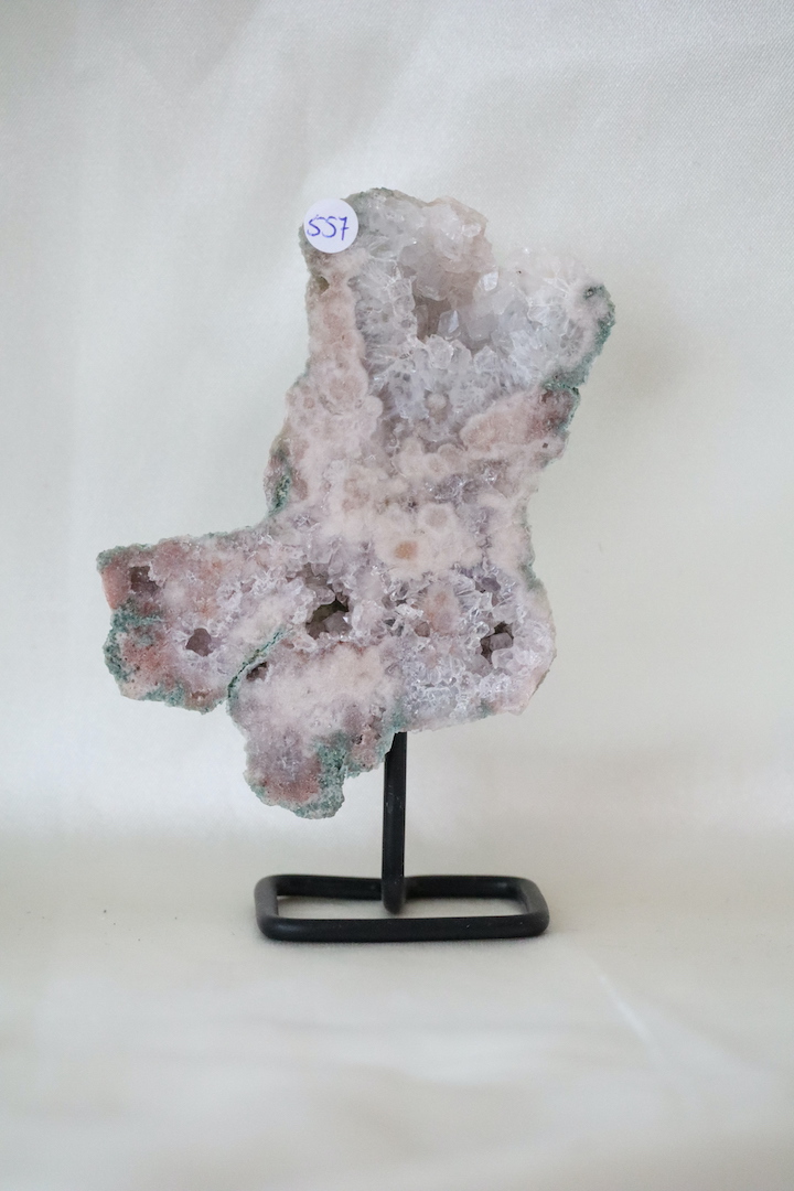 Materiaal: Roze Chalcedoon met Kwarts (druzy)