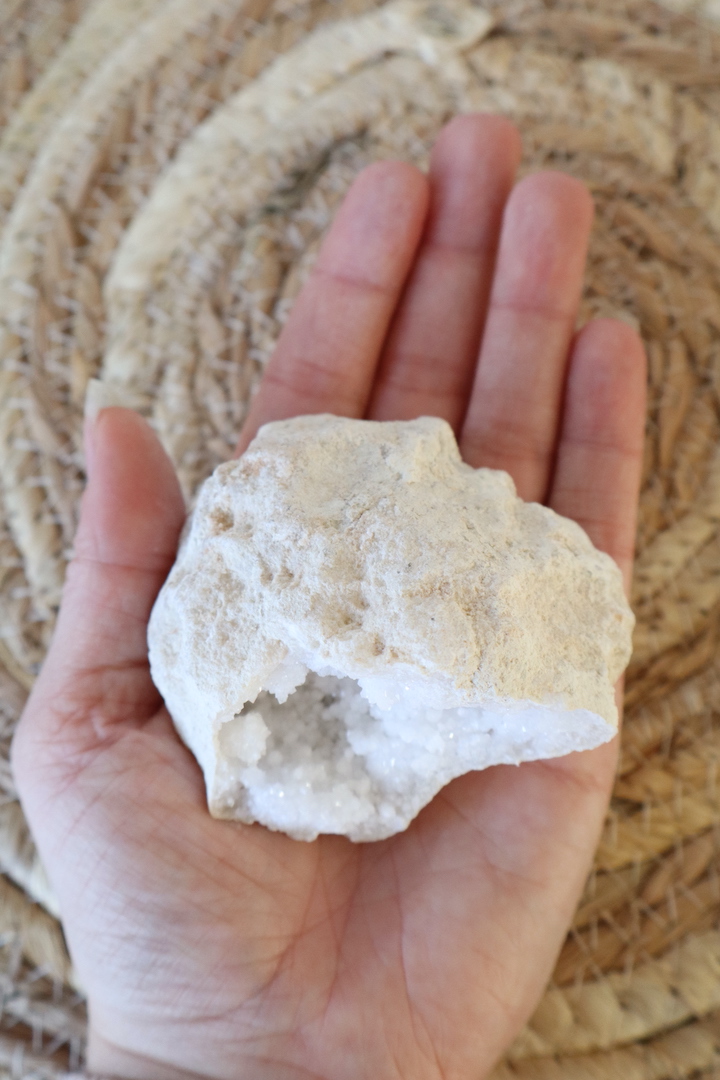 De buitenkant is warm en zandkleurig, ruw en natuurlijk — precies zoals Moeder Aarde haar heeft gevormd. Binnenin ontstaat een helder witte ruimte met een prachtige diepte en een luchtige, open structuur. Dit maakt deze geode bijzonder geschikt voor wie een puur, zacht en uitnodigend stuk zoekt dat de sfeer in huis direct lichter maakt.