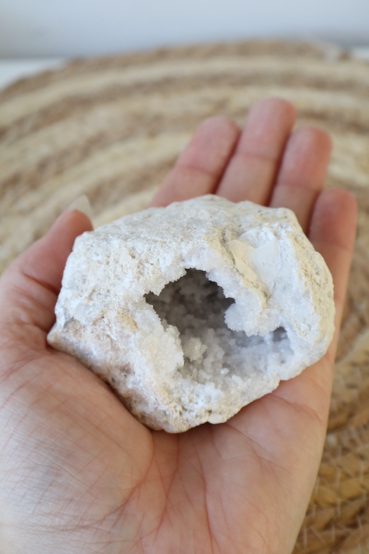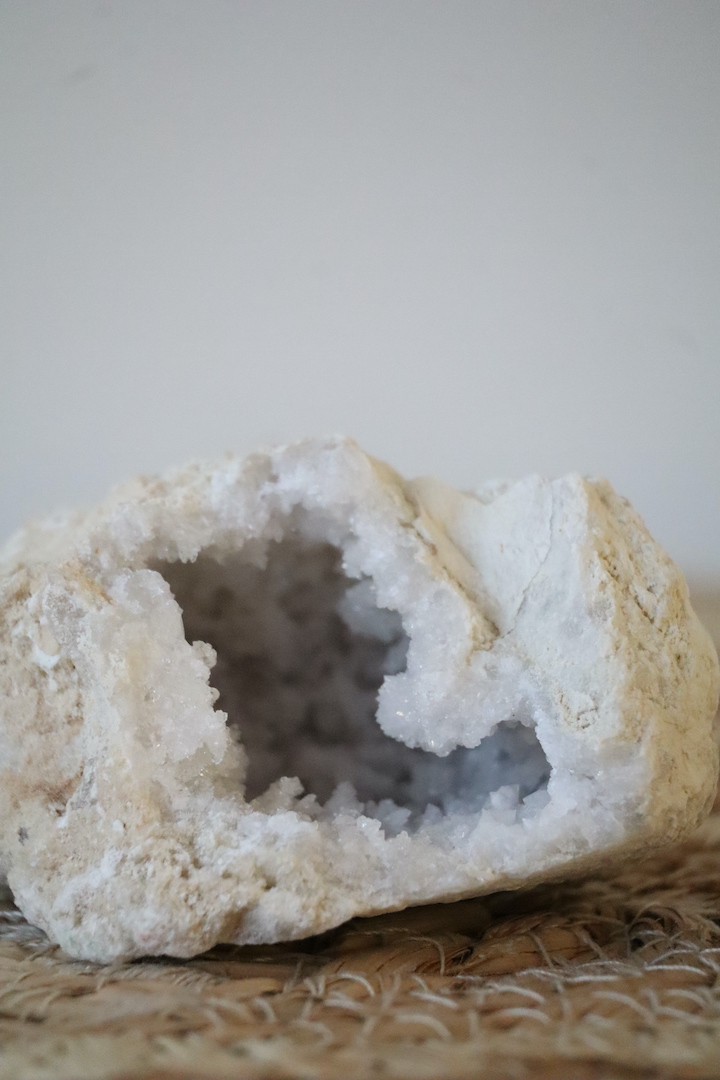 Marokkaanse kwarts geodes zijn gevormd in natuurlijke holtes onder de aarde. Water, mineralen en tijd bouwen laag voor laag een kristalstructuur op. Dit proces kan miljoenen jaren duren. Elk stuk heeft zijn eigen karakter: deze geode is verfijnd, puur en helder — perfect voor iemand die op zoek is naar zachte, subtiele energetische begeleiding.