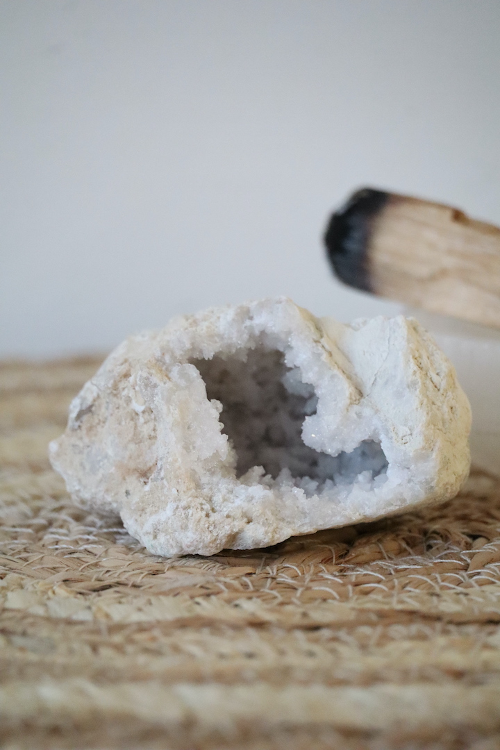 Het is een geode die niet nadrukkelijk aanwezig is, maar juist die subtiele serene sfeer brengt waar Spiritueel Wonen voor staat.