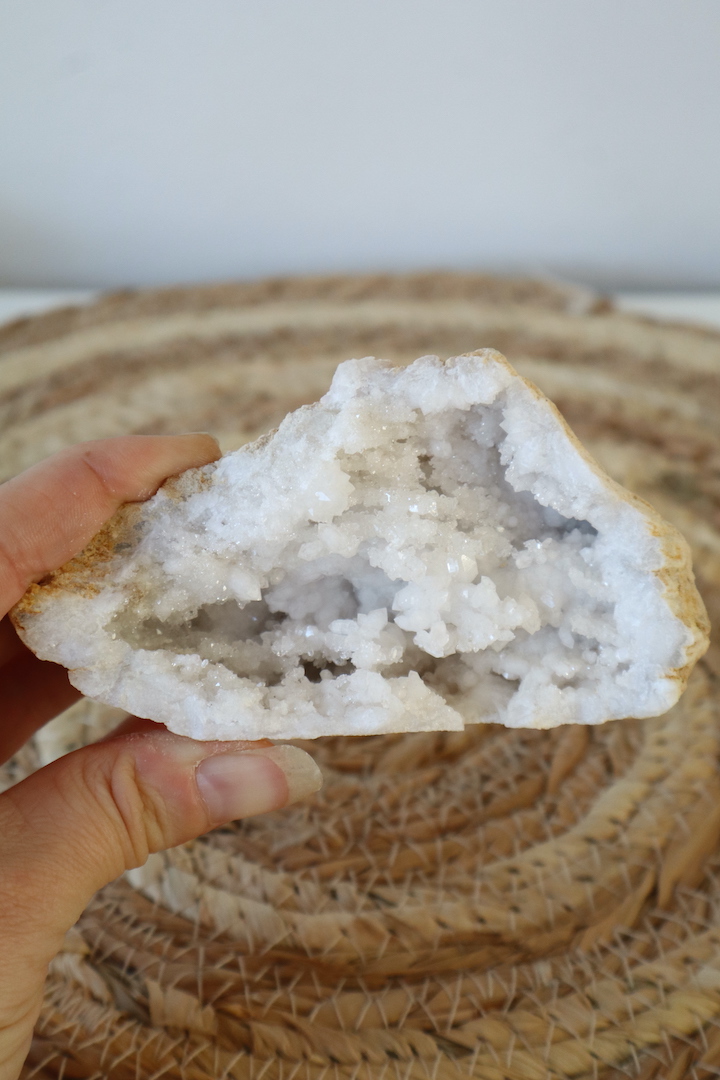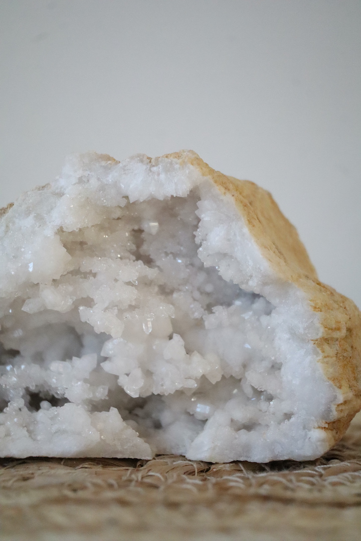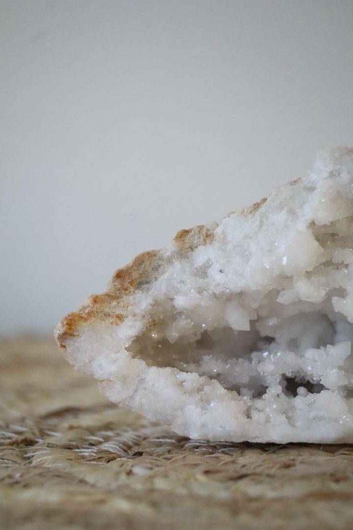Marokkaanse geodes worden gevormd in natuurlijke holtes diep onder de aarde. Water, mineralen en tijd creëren in volledige stilte kristallen die laag voor laag naar binnen groeien. Elke geode is uniek; deze heeft een opening die mooi naar voren breekt en een diepte waarin talloze kristalpunten glinsteren.