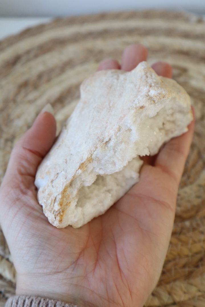 Deze Marokkaanse kwarts geode voelt als een moment van stilte dat je in je handen kunt dragen. Met haar open kristalstructuur, subtiele glans en natuurlijke beige-witte aardetinten brengt ze een rustige, zachte sfeer in elke ruimte. De kristallen zijn dicht en sprankelend, met kleine clusterformaties die het licht op een verfijnde manier weerkaatsen — alsof je een miniatuurlandschap van glinsterende ochtendrijp bekijkt.